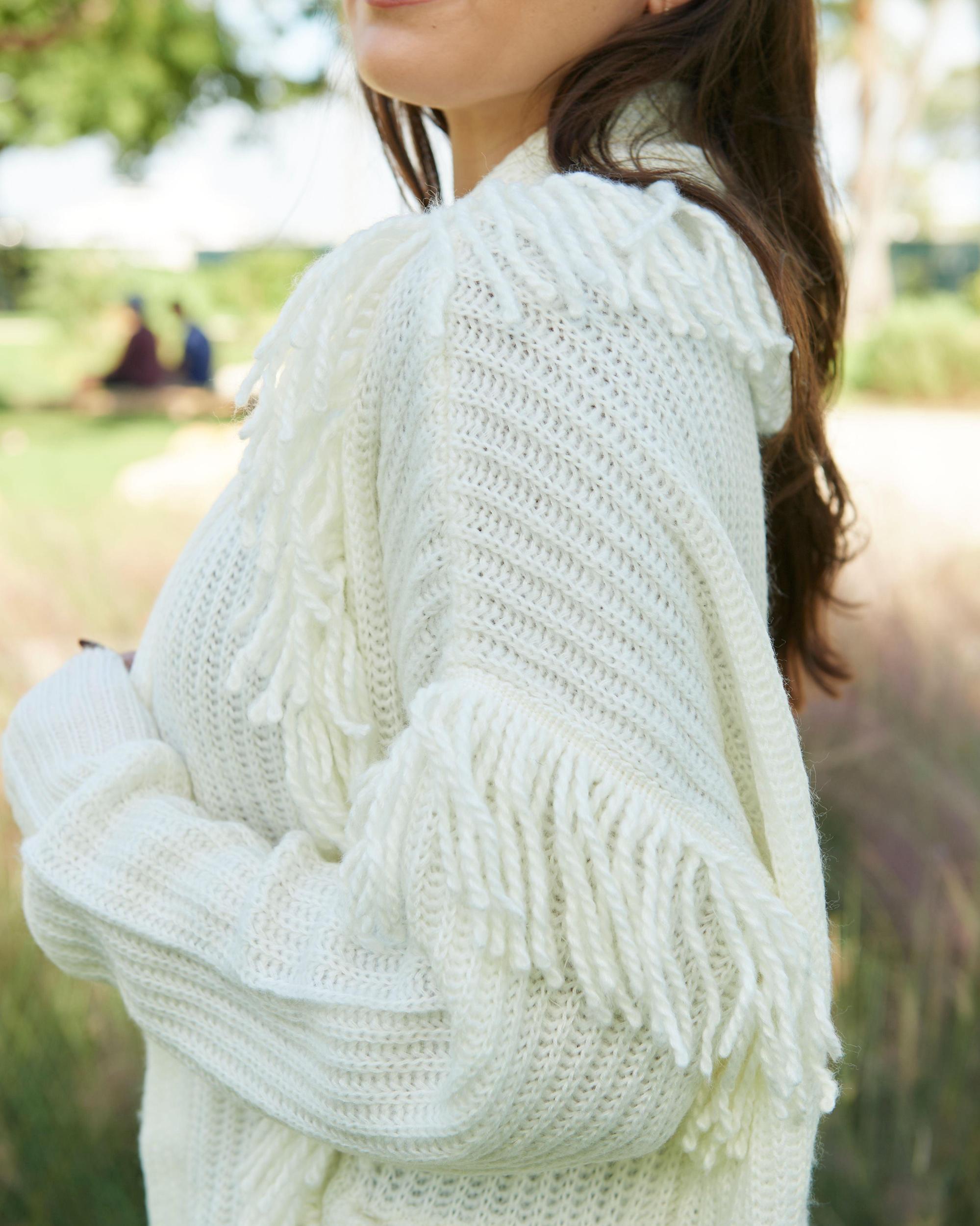 Wardrobe essential for the chilly months ahead. Elevate your everyday look with this ivory cardigan. With its trendy fringe detail, this cardigan is perfect for chilly fall and winter days. Cozy up in this cardigan during the winter months. With its soft sweater material, you'll never want to take it off.