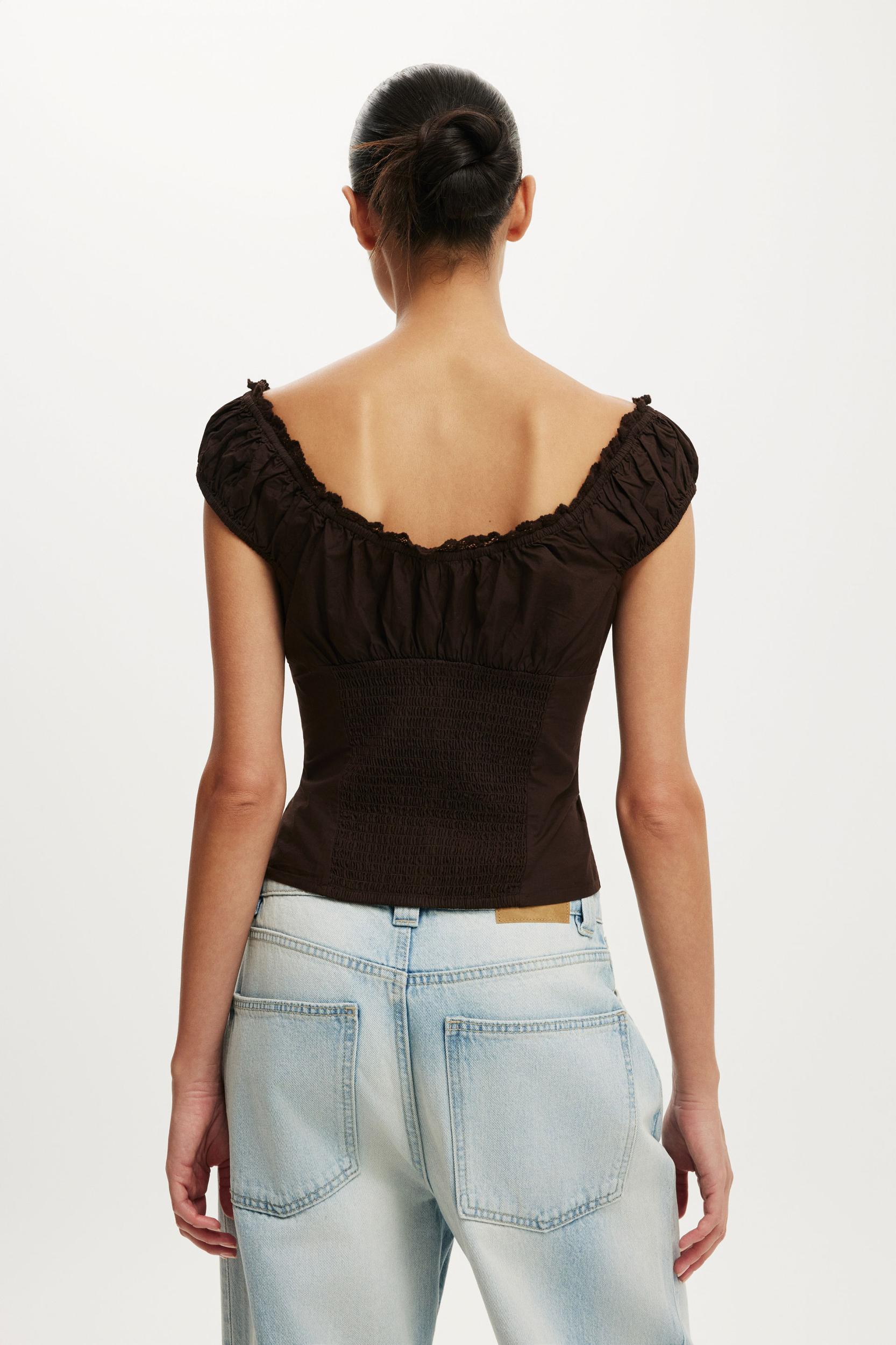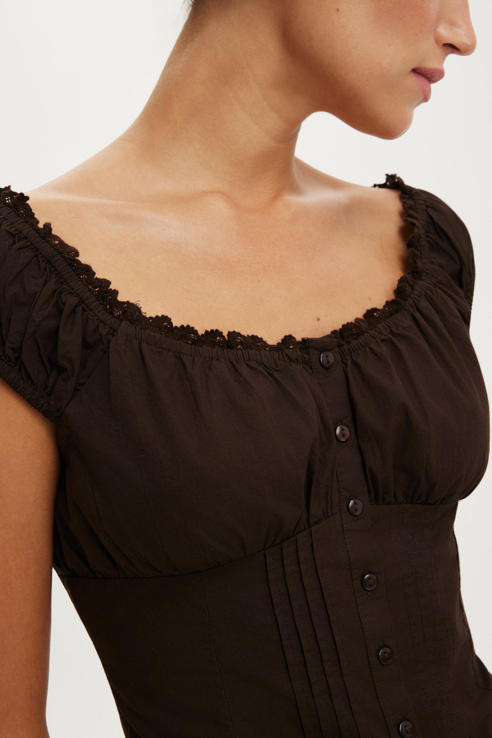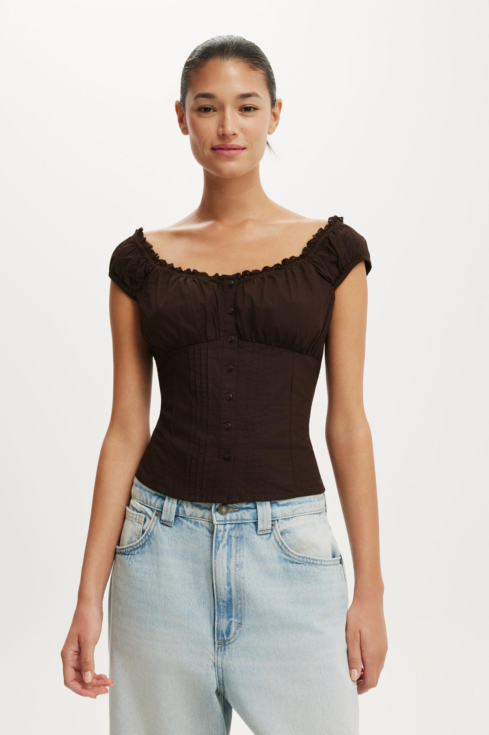 Frill Sleeve Blouse ,Bust Cups ,Elasticated Sleeves ,Centre front opening with button loop closure ,Front paneling details ,Shirred stretchy back