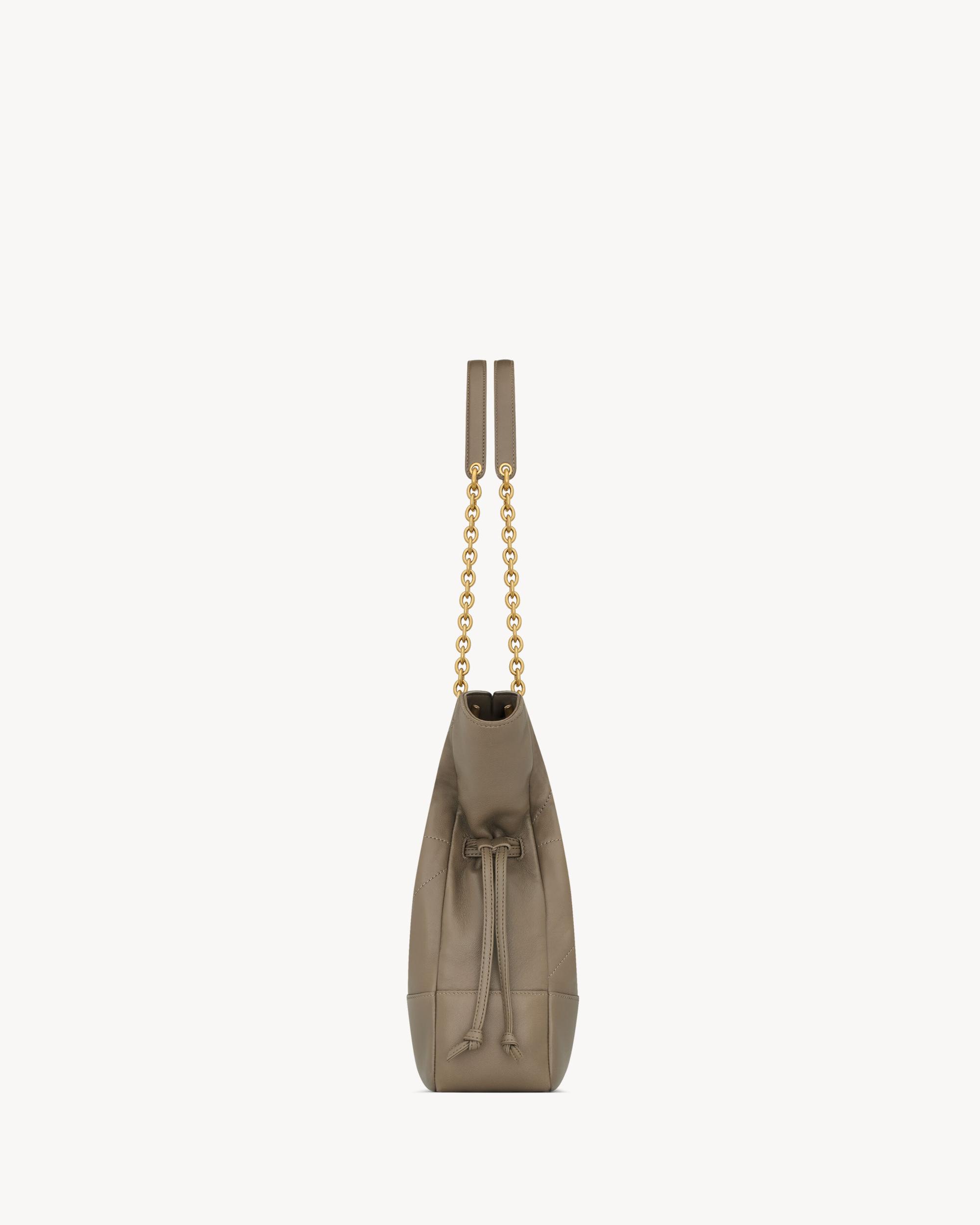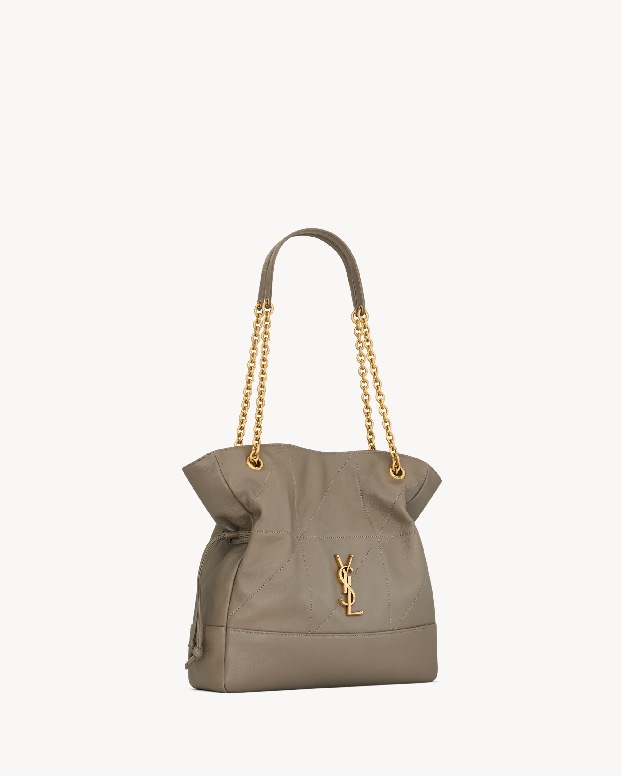 The small tote version of the JAMIE in supple nappa, decorated with the CASSANDRE and CARRÉ RIVE GAUCHE topstitching. This lightweight bag features a removable zip pouch and a chain strap for shoulder carry. Drawstring ties allow the sides to be cinched or expanded to create different silhouettes.