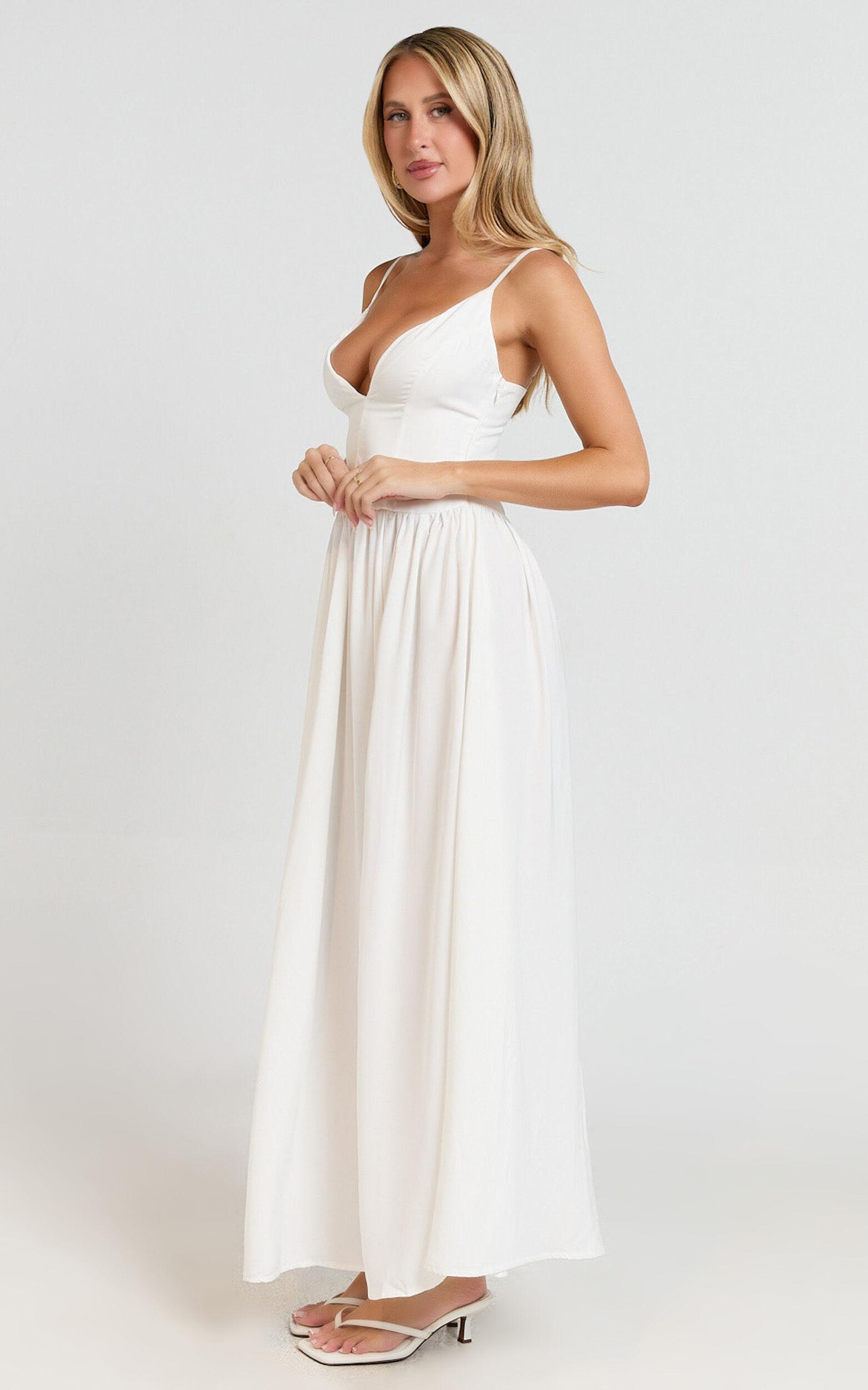 Jamilla Maxi Dress - Plunge Drop Waist High Leg Split Dress in Off White