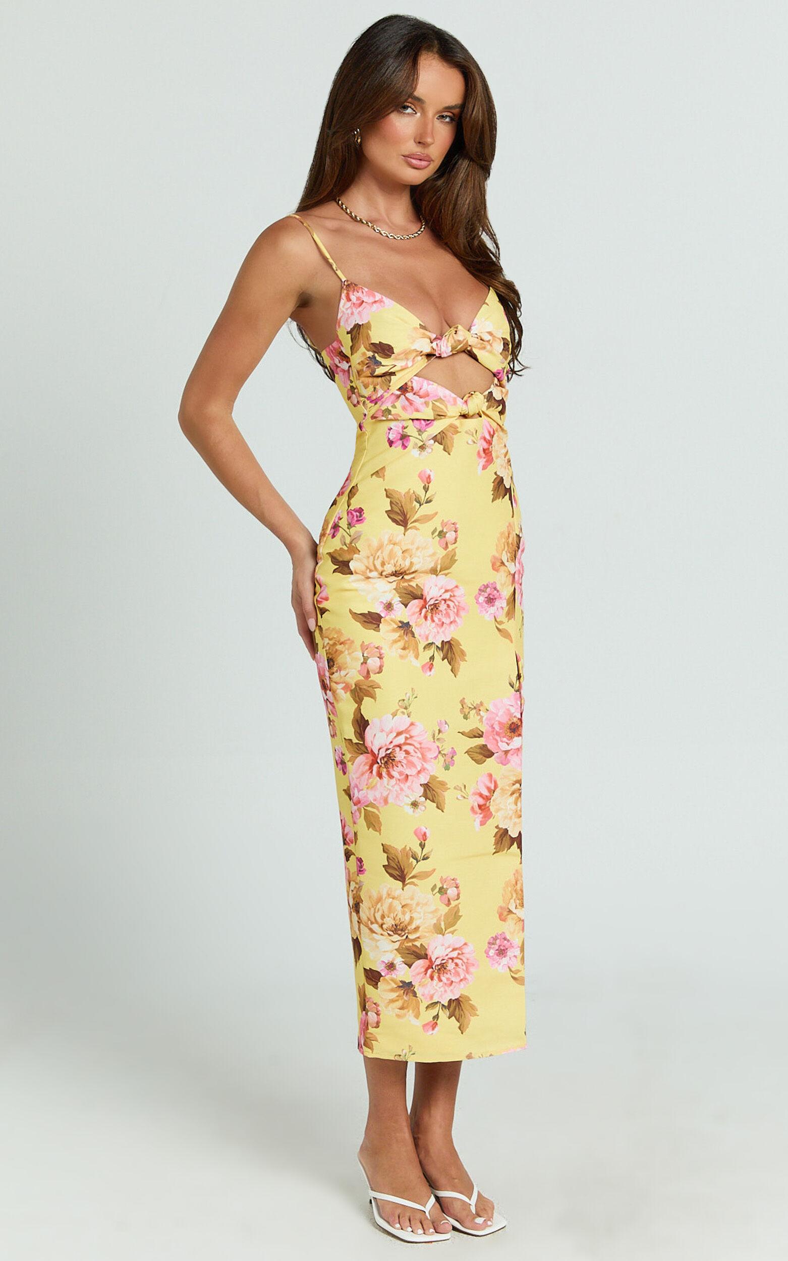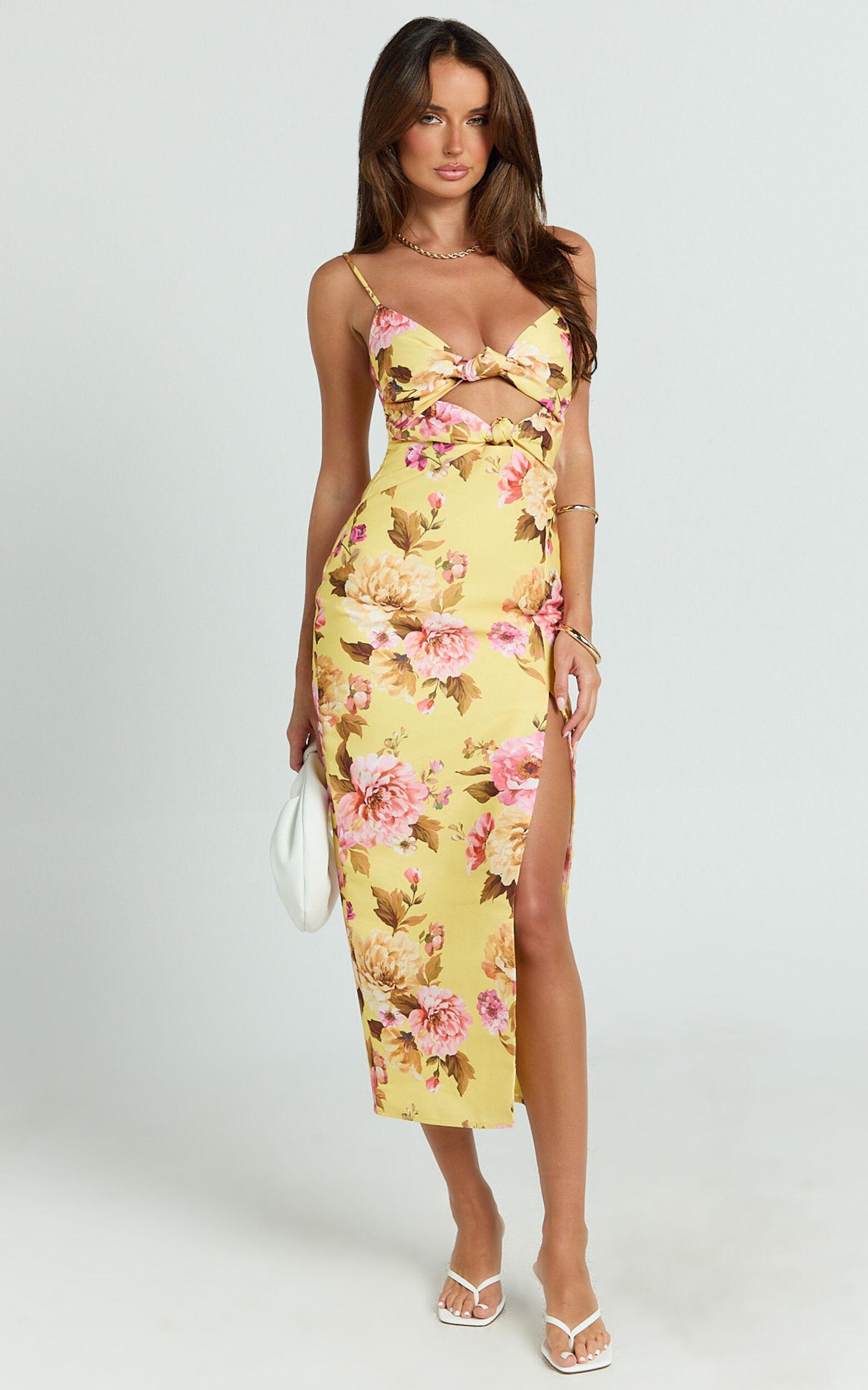 Janice Midi Dress - Knot Detail Front Split Dress in Sunshine Floral