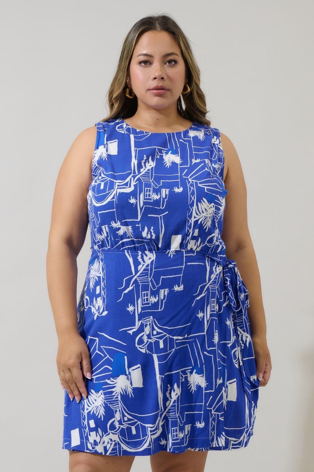 Take on the day in this bold printed mini dress. A wrap style includes an elastic stretch around the waist. A sleeveless look frames a round neck and an invisible zipper in the back. Wear white heels to match the dress.
