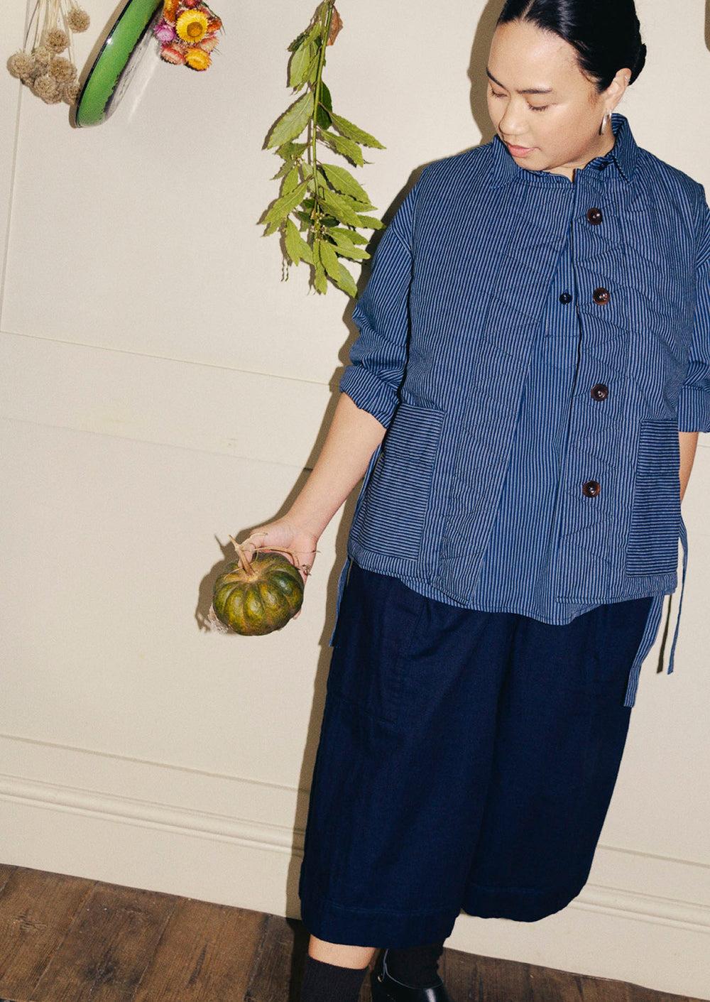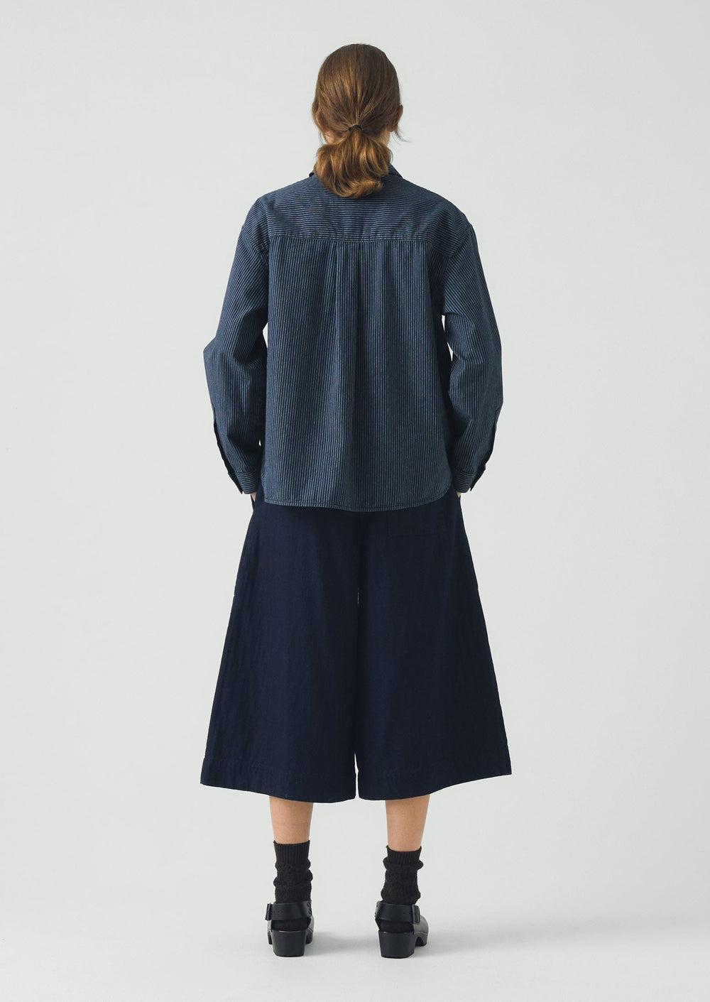 Our culottes fall to the calf and feature pleats at the front for volume. Made from Japanese-woven cotton denim, which is soft and double-faced, then punctuated by patch pockets and a single back patch pocket.