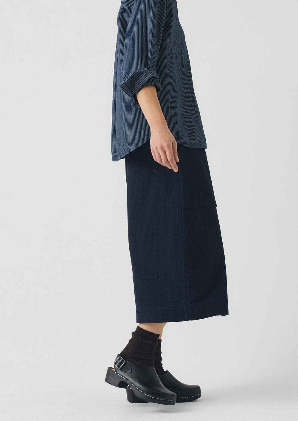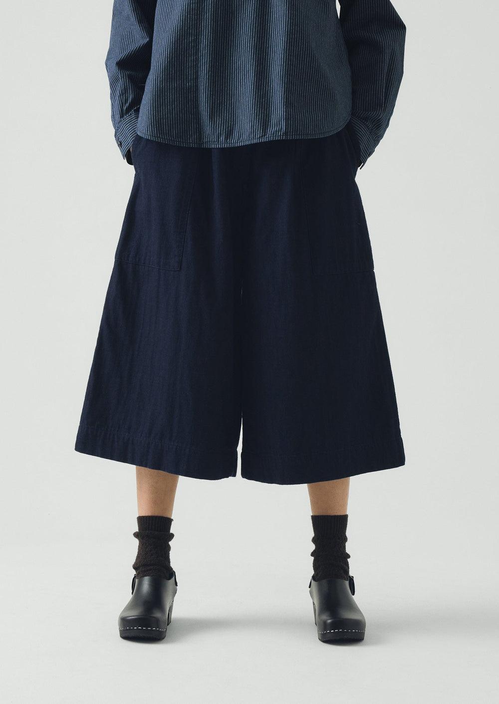 Japanese indigo cotton denim. Calf length. Patch pockets. Back patch pocket. Zip and corozo button.