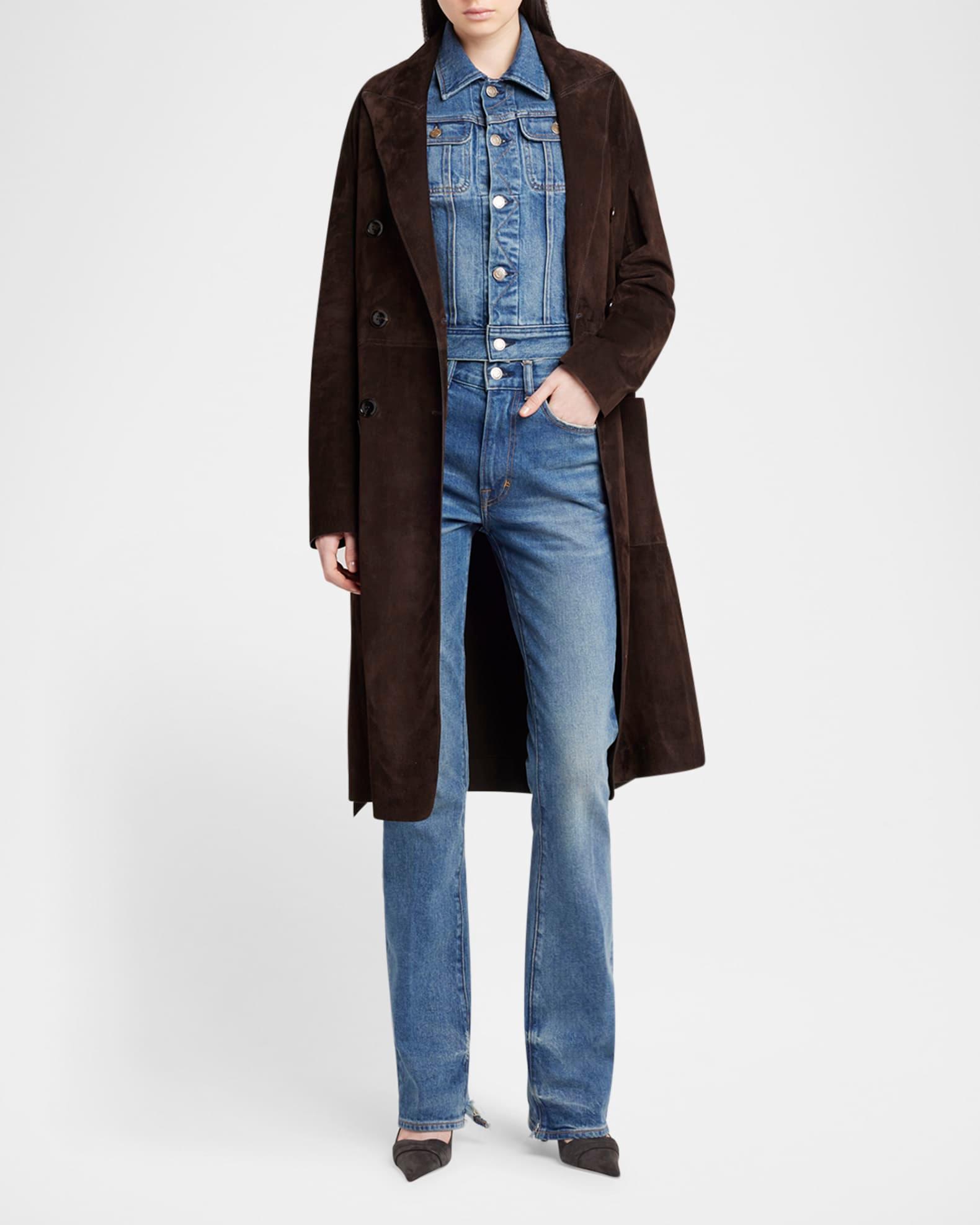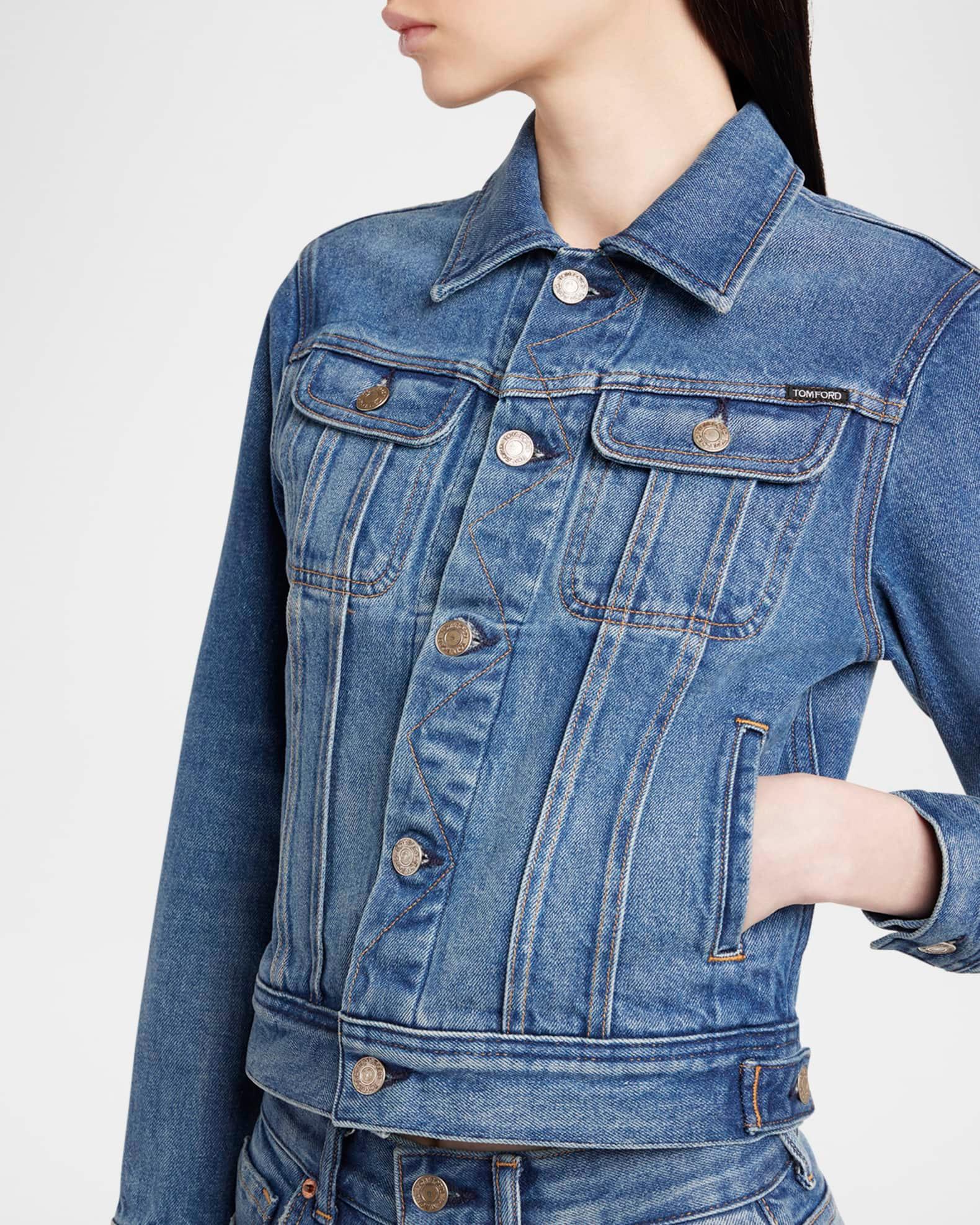 TOM FORD denim jacket in Japanese stonewashed comfort denim with a logo suede patch on the hem Point collar; single-breasted front Long sleeves; button cuffs Chest button-flap pockets Hip welt pockets Slim fit Hip length Button-tab hem Button closure Cotton/polyacetelyne Made in Japan
