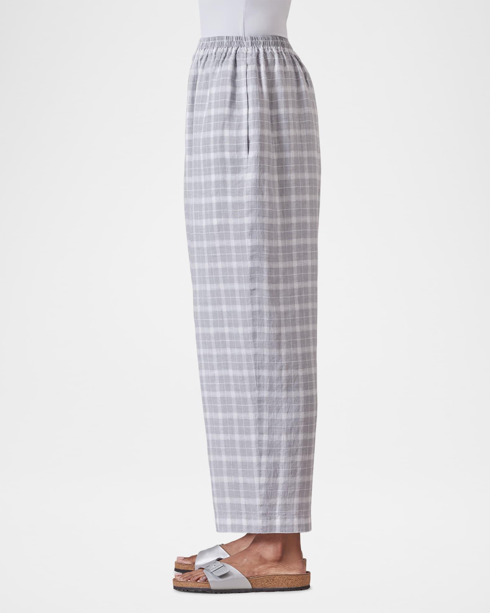 Eskandar Japanese trousers with a check motif and elasticized waistband Mid rise sits high on hip Side split pockets Wide legs Cropped at the ankle Pull-on style Linen Made in Albania