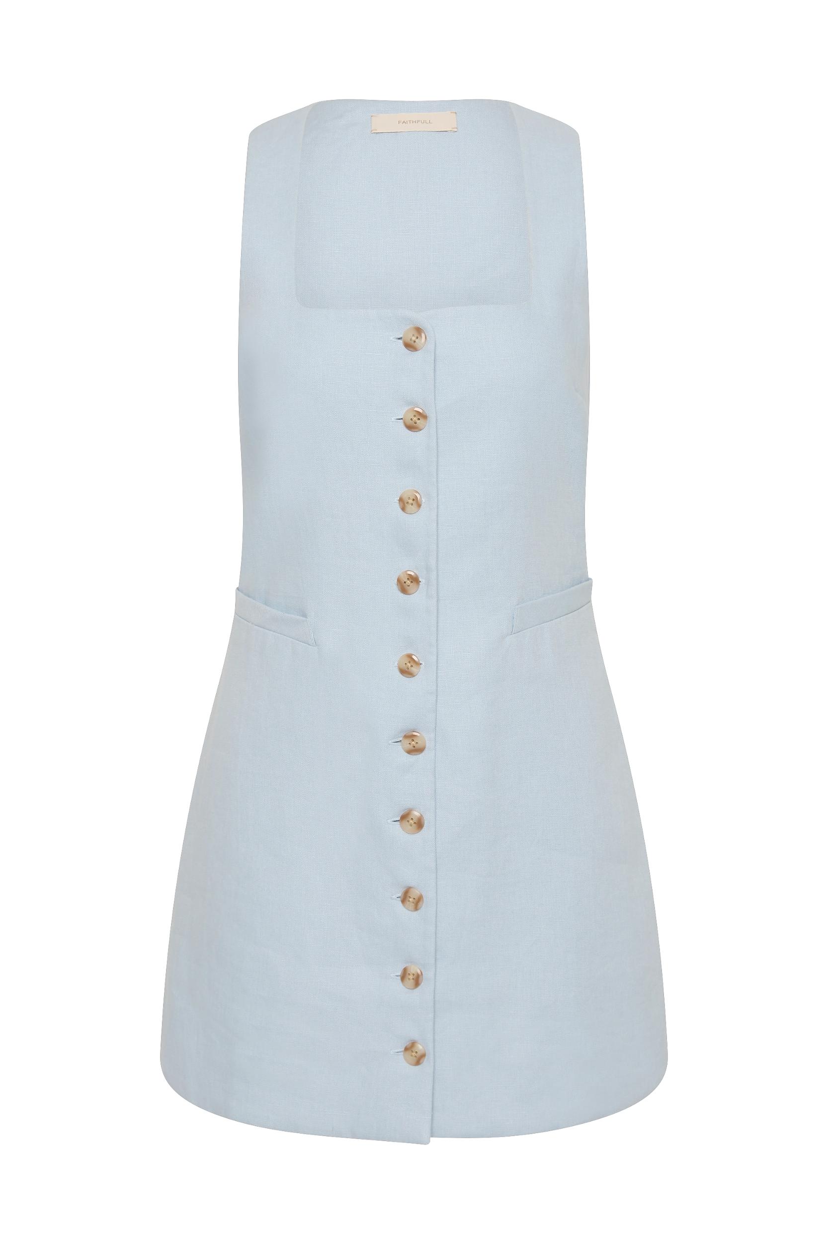 A signature FAITHFULL silhouette, reimagined with new elevated details and designed from a 100% European Flax® linen fabrication in a soft sky blue colour. It is a sleeveless mini dress with a low squared neckline and wide straps. Semi-fitted with a straight skirt, it features classic buttons down the front as well as a back waist belt, adjustable in length, and front pocket detailing. Style with simple accessories for summer-inspired everyday wear or vacation wear.This style is true to size. The back waist belt is adjustable for custom cinching at the waist.