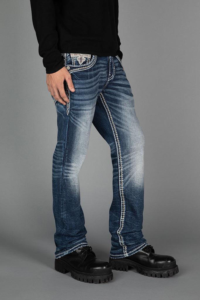 Custom pewter buttons and rivets throughout. Iconic inverted Fleur de Lis on back pockets with multi-color stitching. Accented with white leather throughout. "Rock Revival" engraved on beige and khaki leather patch on the waist. Designed with care and creativity in Los Angeles, California.