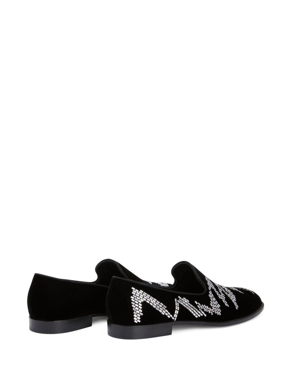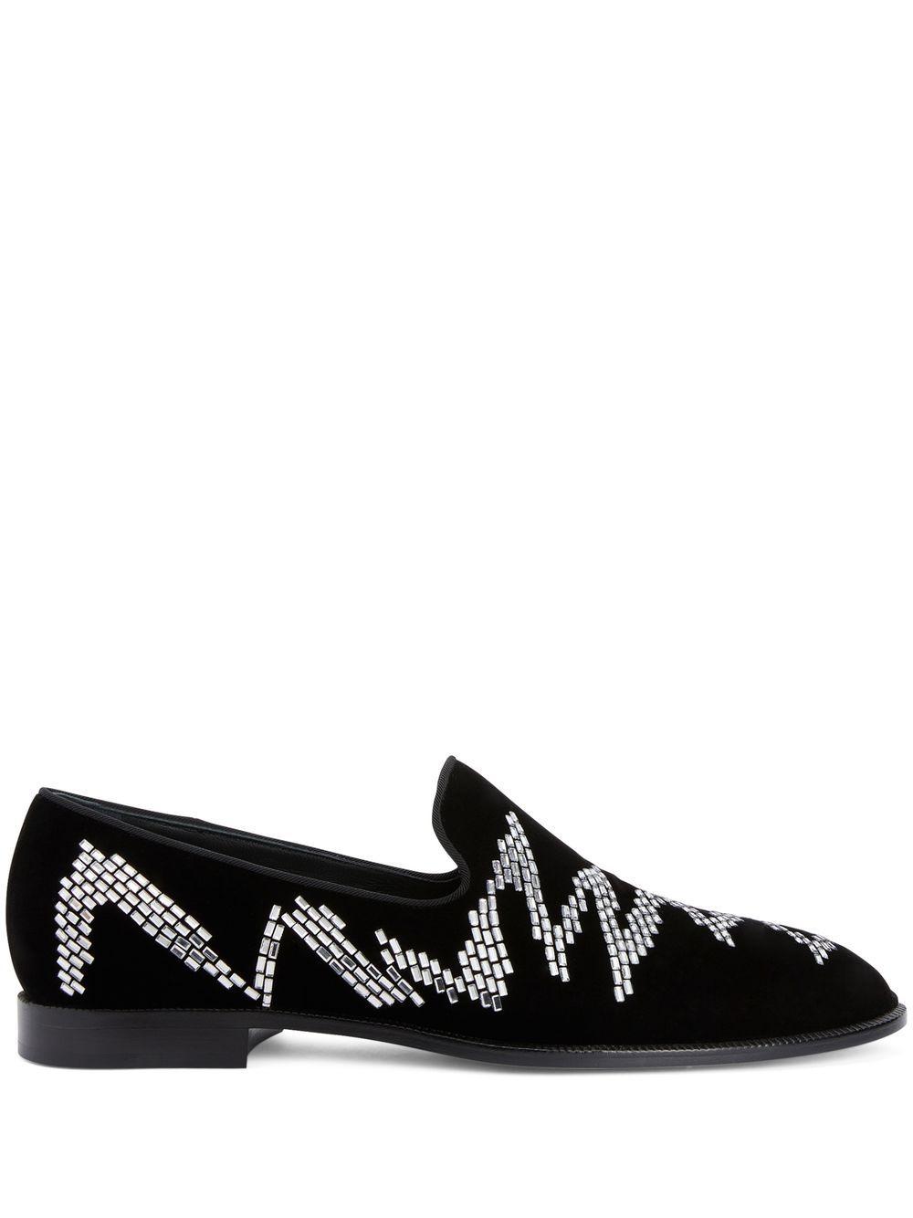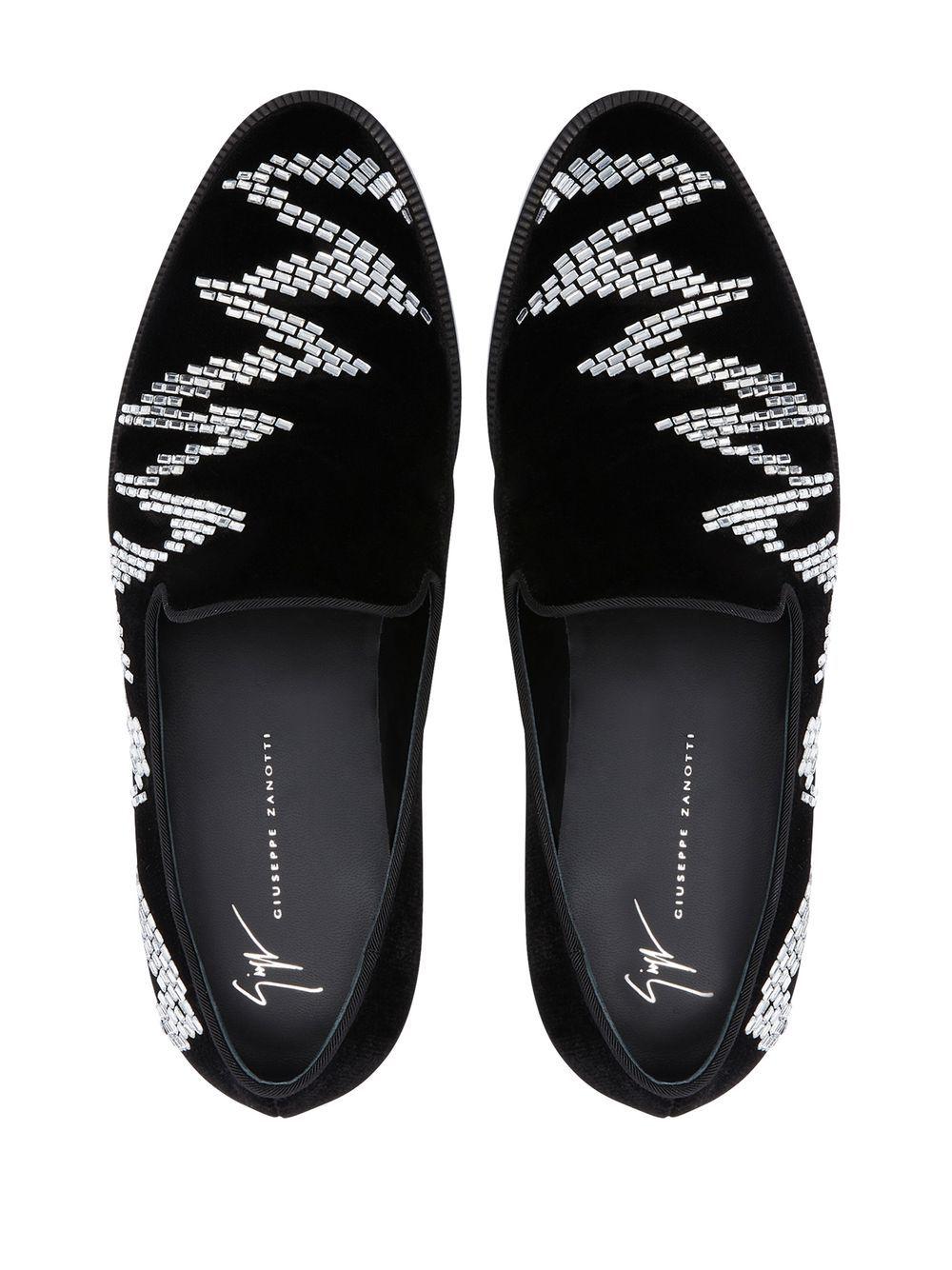 Giuseppe Zanotti Jareth Shake loafers | Black | Jareth Shake loafers from Giuseppe Zanotti featuring black, leather, velvet effect, rhinestone embellishment, almond toe, branded insole and flat rubber sole. | Velvet/Rhinestone/Leather/Leather/Leather | Loafers | Shoes | Men