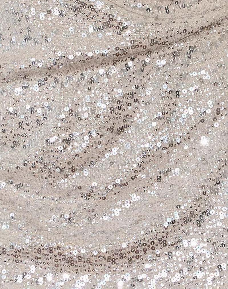 The Jasilia dress in a neutral sequin fabric, features long sleeves and a mini length fit with elasticated waist, boat neckline and key hole cut out detailing at the back. MODEL WEARS SIZE: EXTRA SMALL - MODEL HEIGHT:5'7
