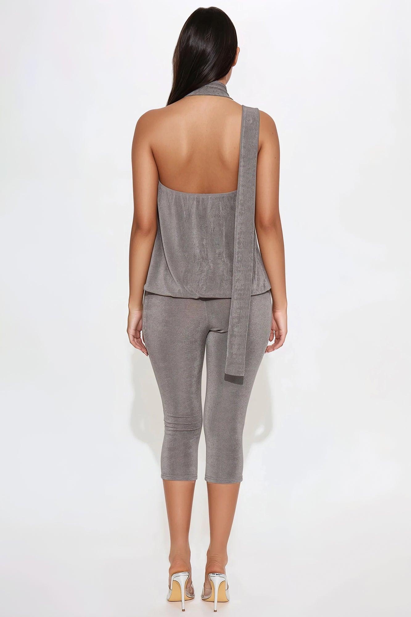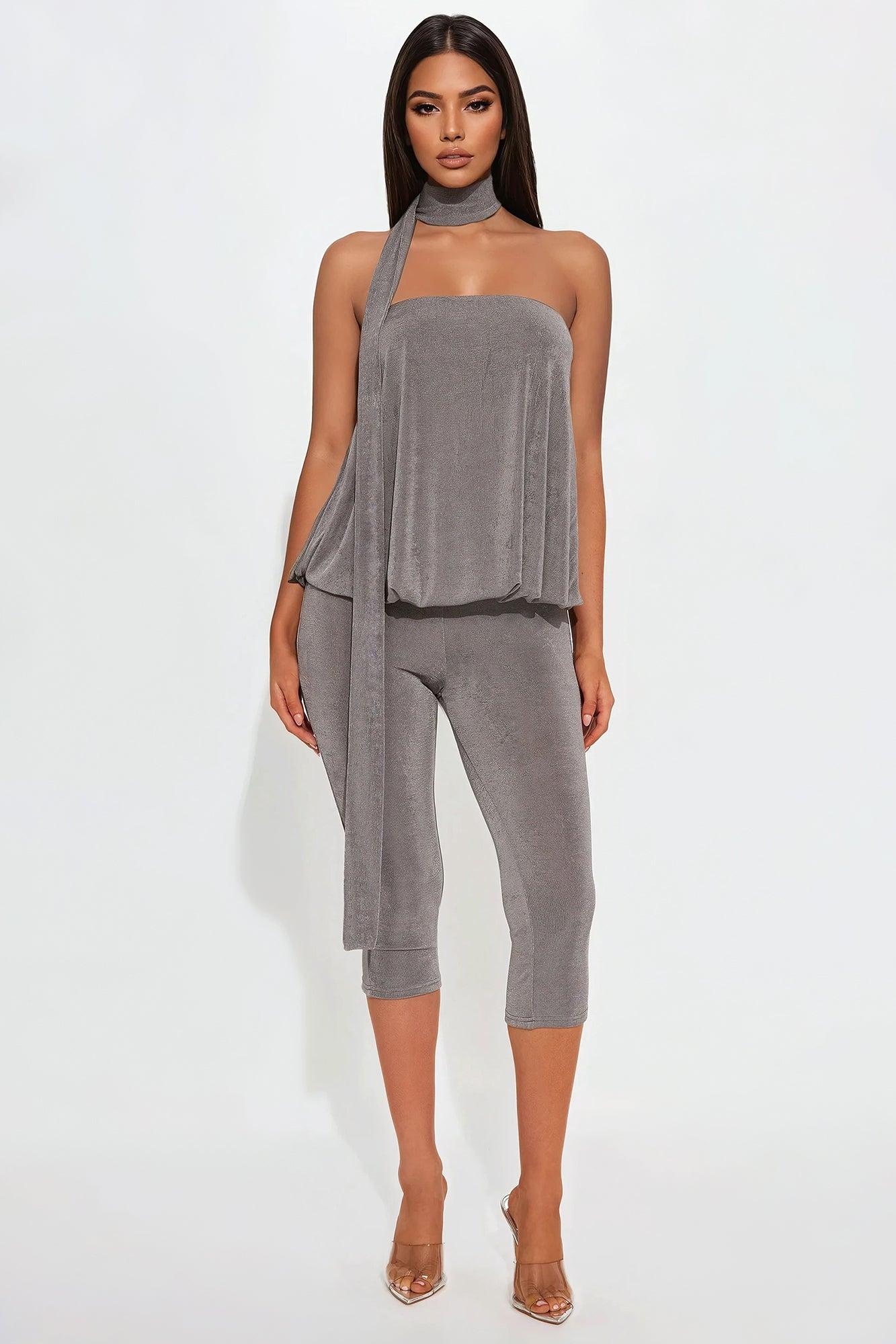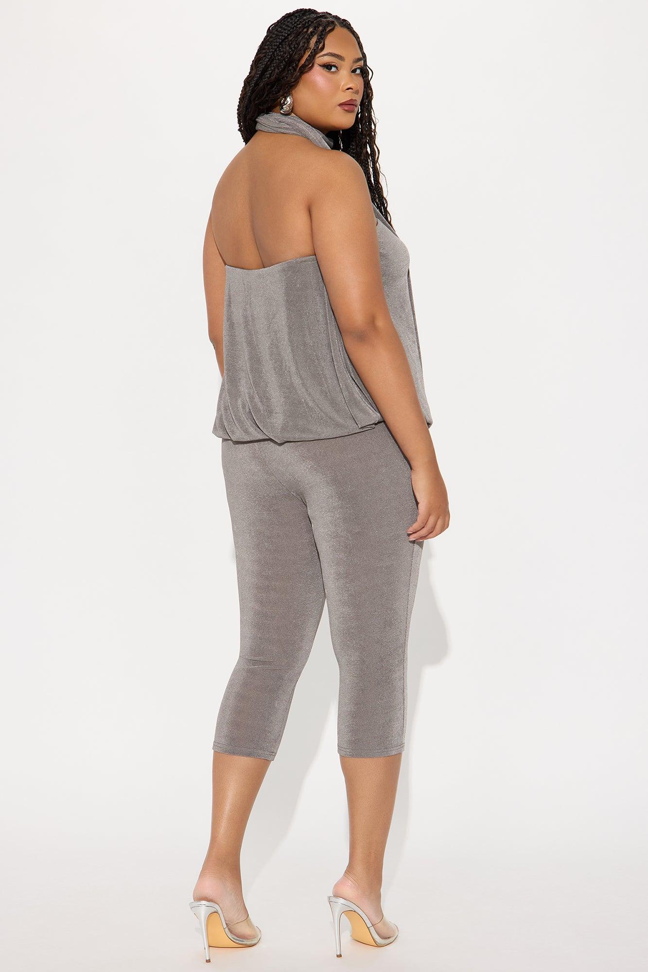 Available In Silver. Jumpsuit Neck Tie Included Lined Top Skinny Leg Stretch Inseam = 19" Disclaimer: Not Recommended For People With Sensitive Skin. Shell: 95% Polyester 5% Spandex Imported