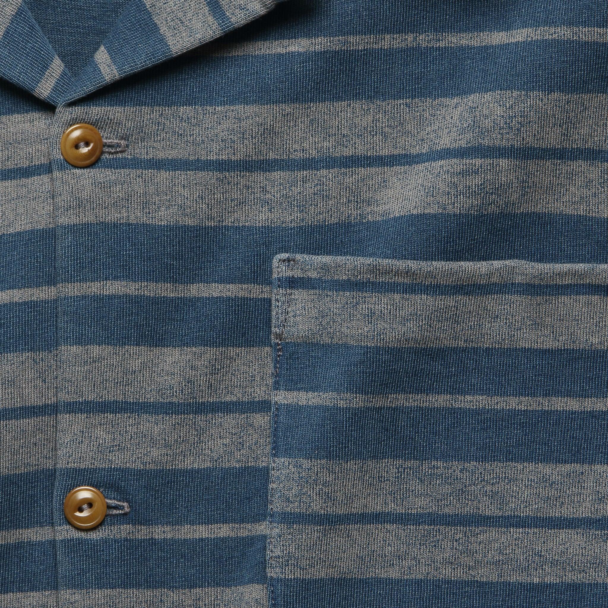 This Jasper Camp Shirt from Double RL is made with a lightweight cotton jersey that’s been dyed with true indigo and printed with a broad horizontal stripe pattern. It’s tailored with a classic, relaxed vacation shirt silhouette and detailed with a single chest pocket, two waist pockets, corozo buttons, and a classic camp collar to top it off.