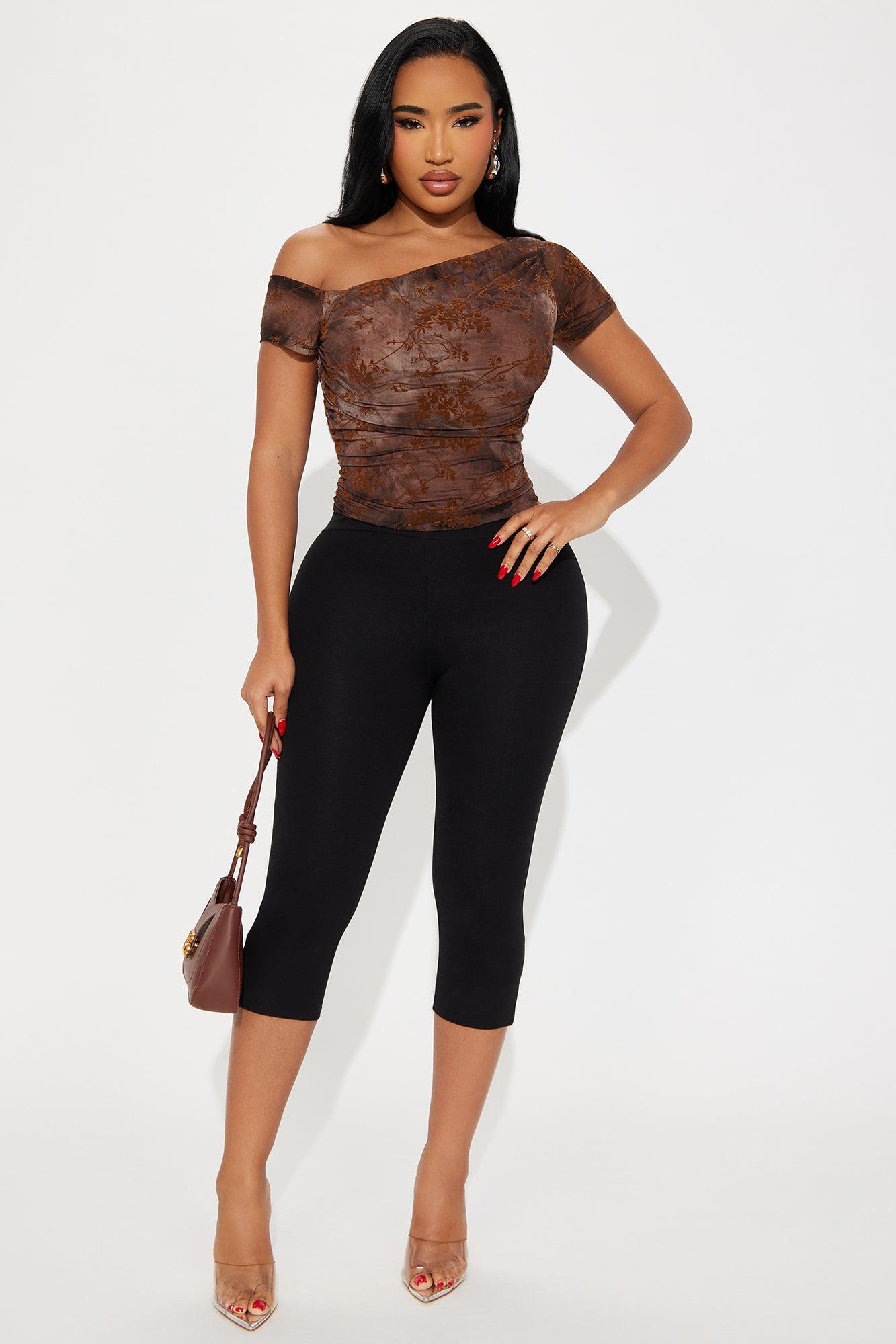 Available In Brown/combo. Top Off Shoulder Ruched Flocked Stretch Disclaimer: Pattern Placement May Vary. Self- 95% Polyester 5% Spandex Lining- 100% Polyester Imported