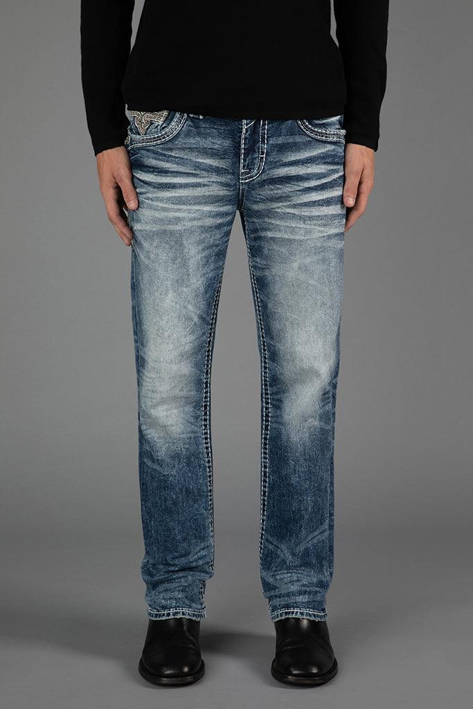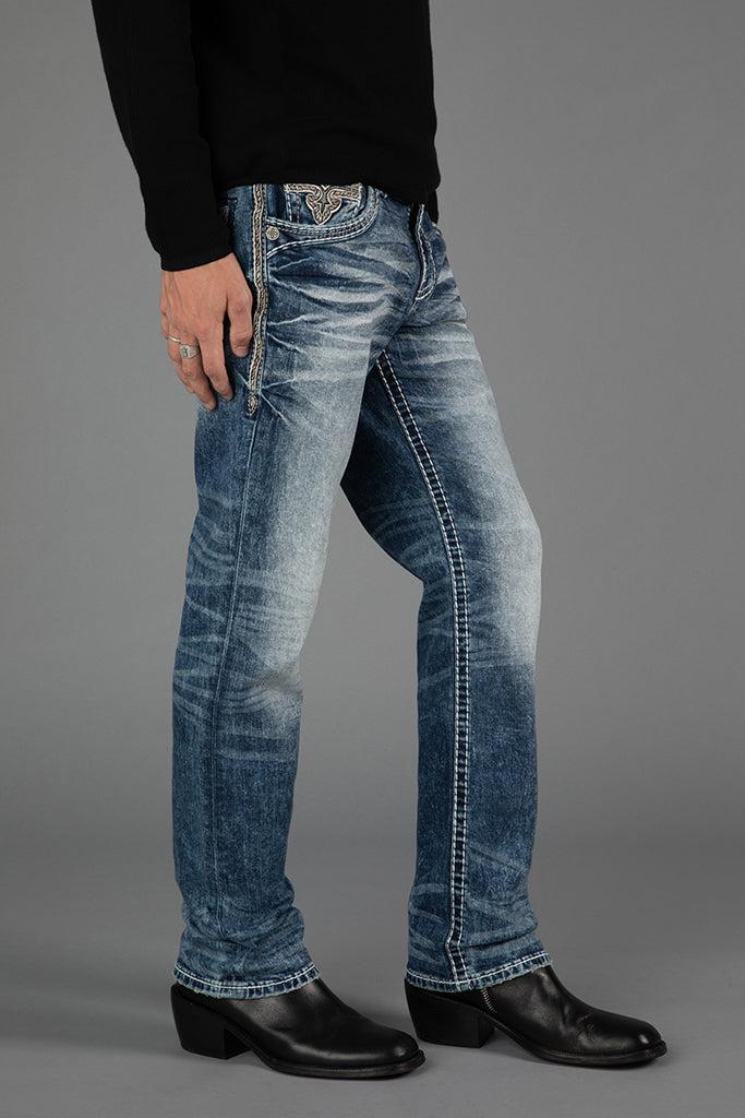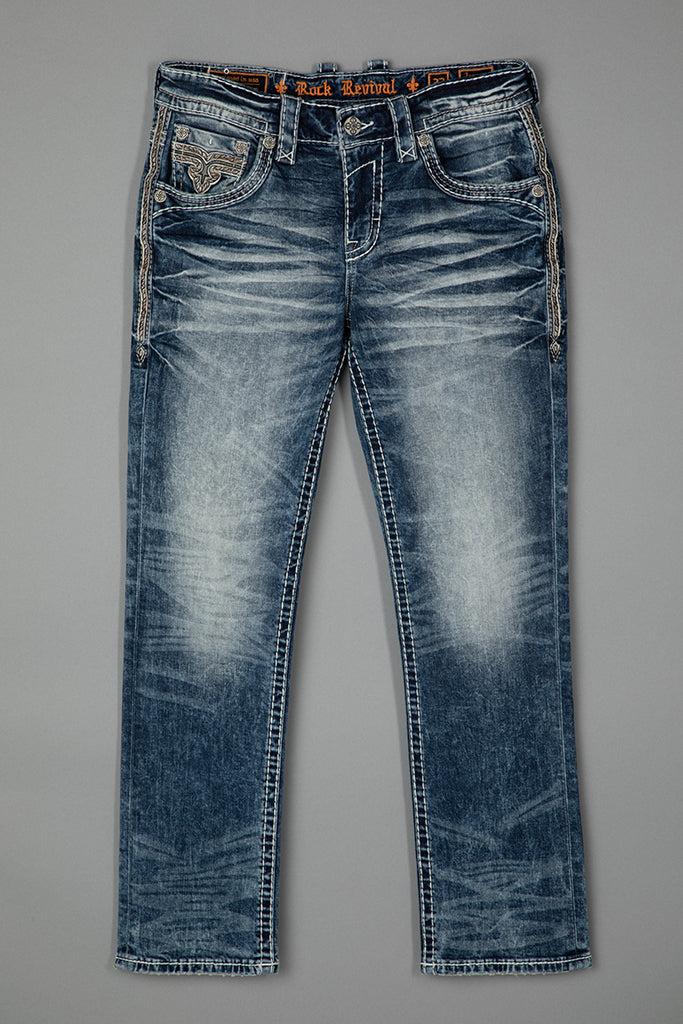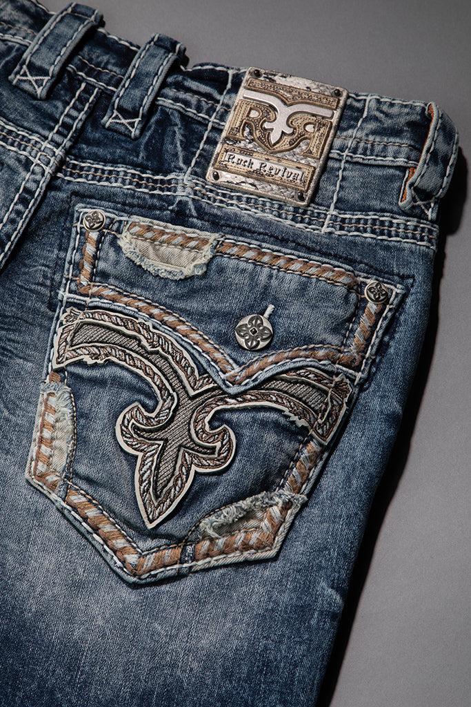 Custom pewter white brushed rivets and buttons throughout. Iconic inverted Fleur de Lis on back pockets with lasso accents. Patchwork decoration with brown and beige stitching, complemented by white leather throughout. "Rock Revival" metal engraved on a brown and beige snake leather patch on the belt loop Designed with care and creativity in Los Angeles, California.