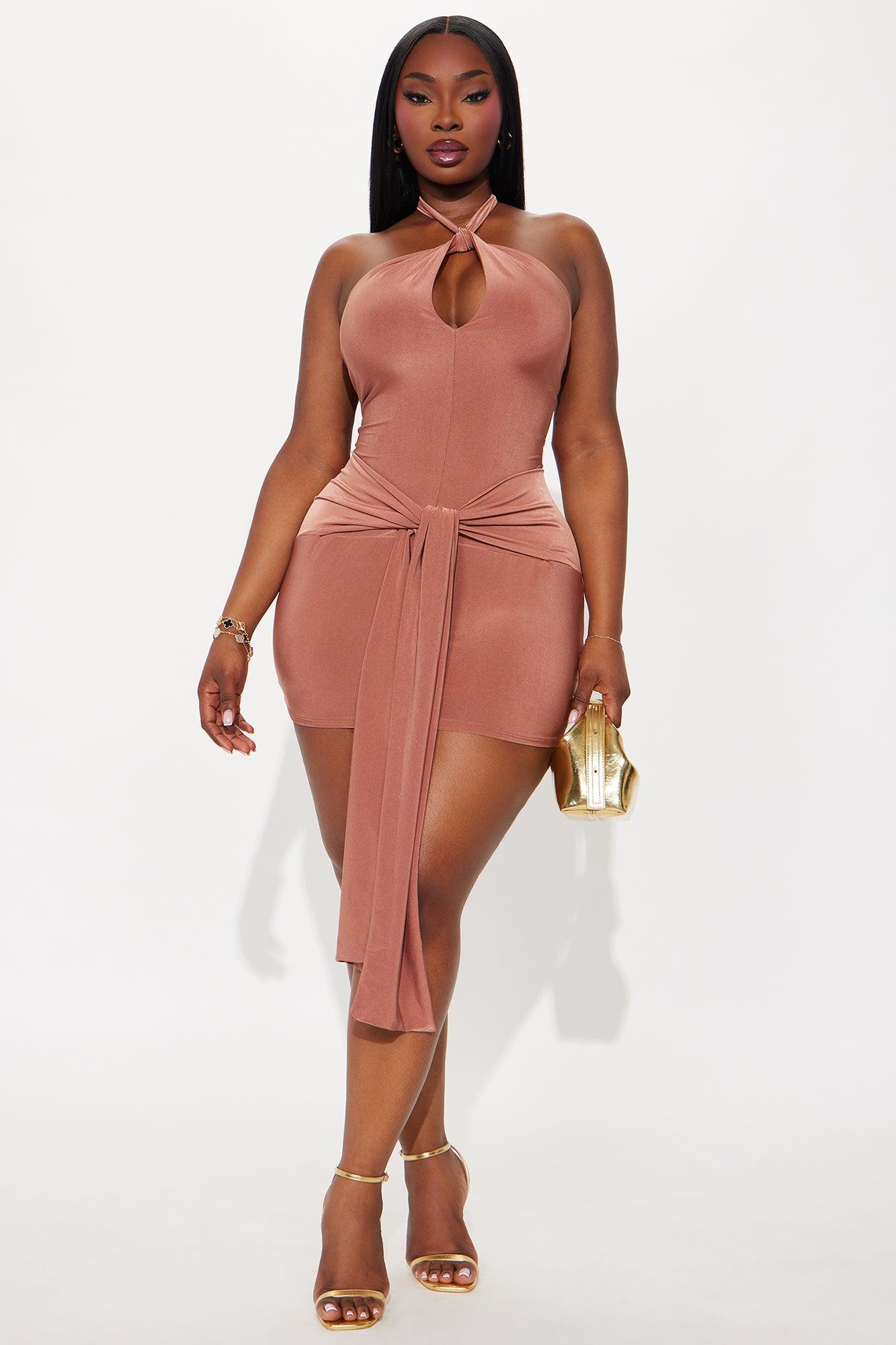 Available In Aqua And LightBrown. Mini Dress Stretch Lined Halter Neck Keyhole Front Tie Length Measured Flat= 32" Self: 95% Polyester 5% Spandex Lining: 100% Polyester Imported