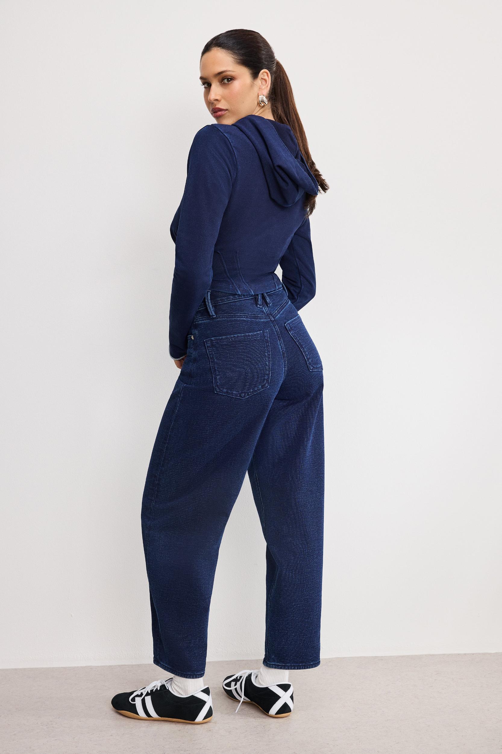 With a clean barrel leg, these sweatpants redefine casual. The tailored shape elevates your everyday style while the soft, denim-inspired terry fabric keeps comfort front and center. Perfect for when effortless cool is the only look you need. High-rise Front zip-fly closure Classic 5-pockets Gap-proof waistband Tummy smoothing technology Relaxed with extremely curved legs Inseam: 28" Model is 5'8 and wearing size 0 Fabric: 100% Cotton Care: Machine wash cold. Tumble dry on low.