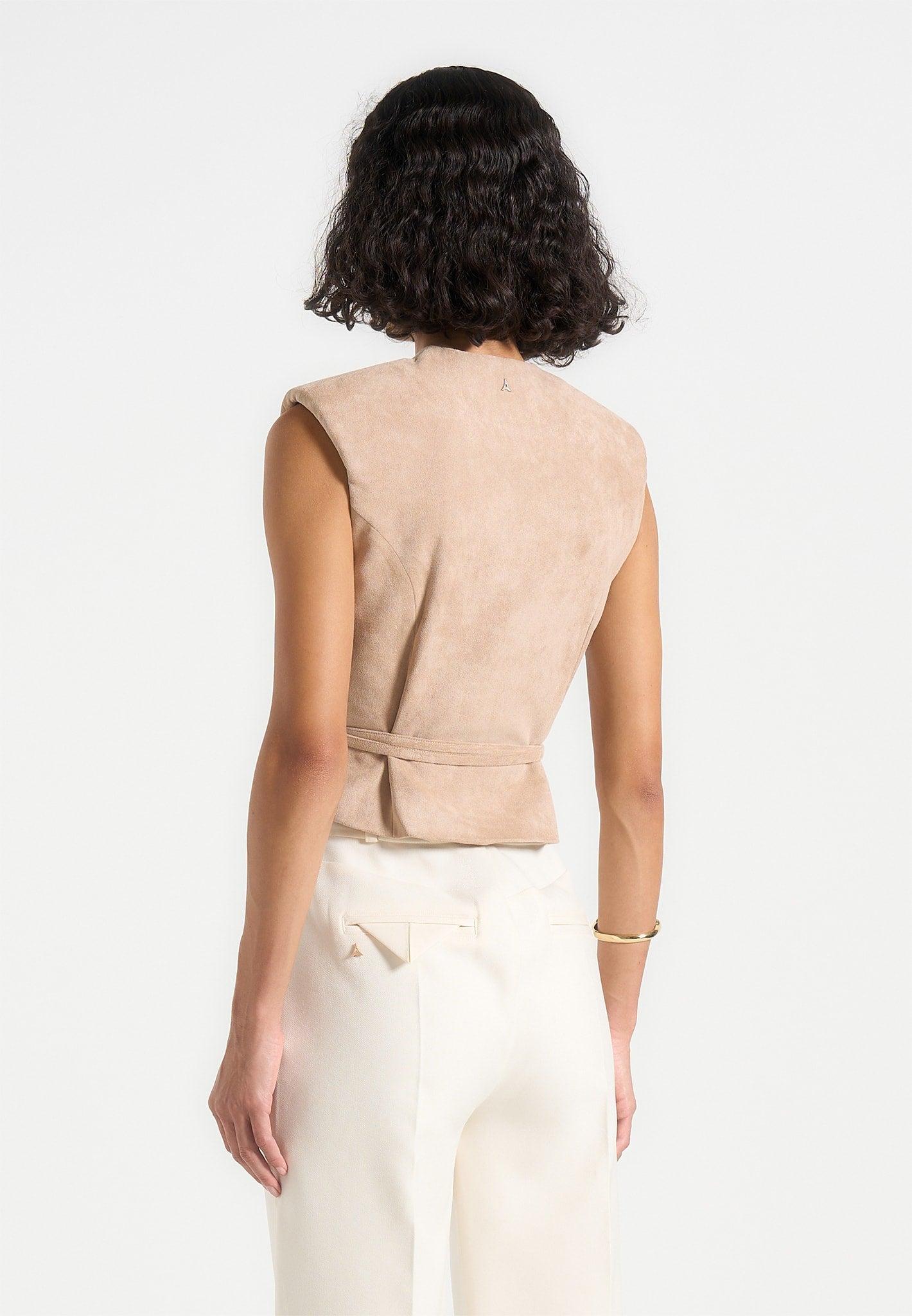 This sleeveless wrap waistcoat brings soft structure and elevated texture to any wardrobe. Crafted from a rich faux suede fabric, it features strong shoulders and a softly draped silhouette, cinched at the waist with a tonal belt and silver hardware detailing. The wrap-style front adds dimension and movement, while the subtle sheen of the fabric gives a refined, modern edge—perfect for dressing up denim or tailoring. Sleeveless wrap silhouette with clean v-neckline Structured shoulder design for a defined upper frame Soft-touch faux suede with a refined matte finish Adjustable wrap belt with silver D-ring closure Silver Manière De Voir plaque on reverse for a premium touch 95% Polyester, 5% Elastane Always check the care label for wash instructions.