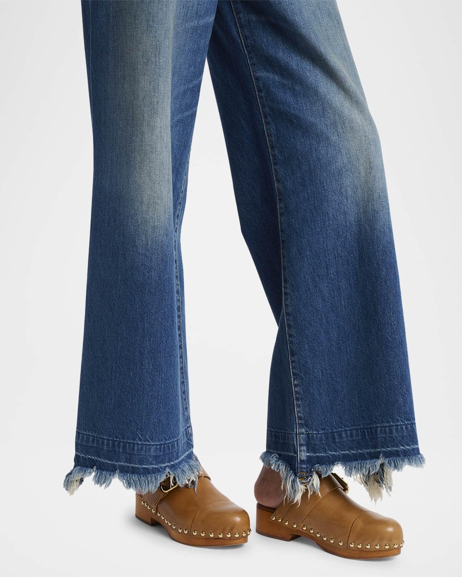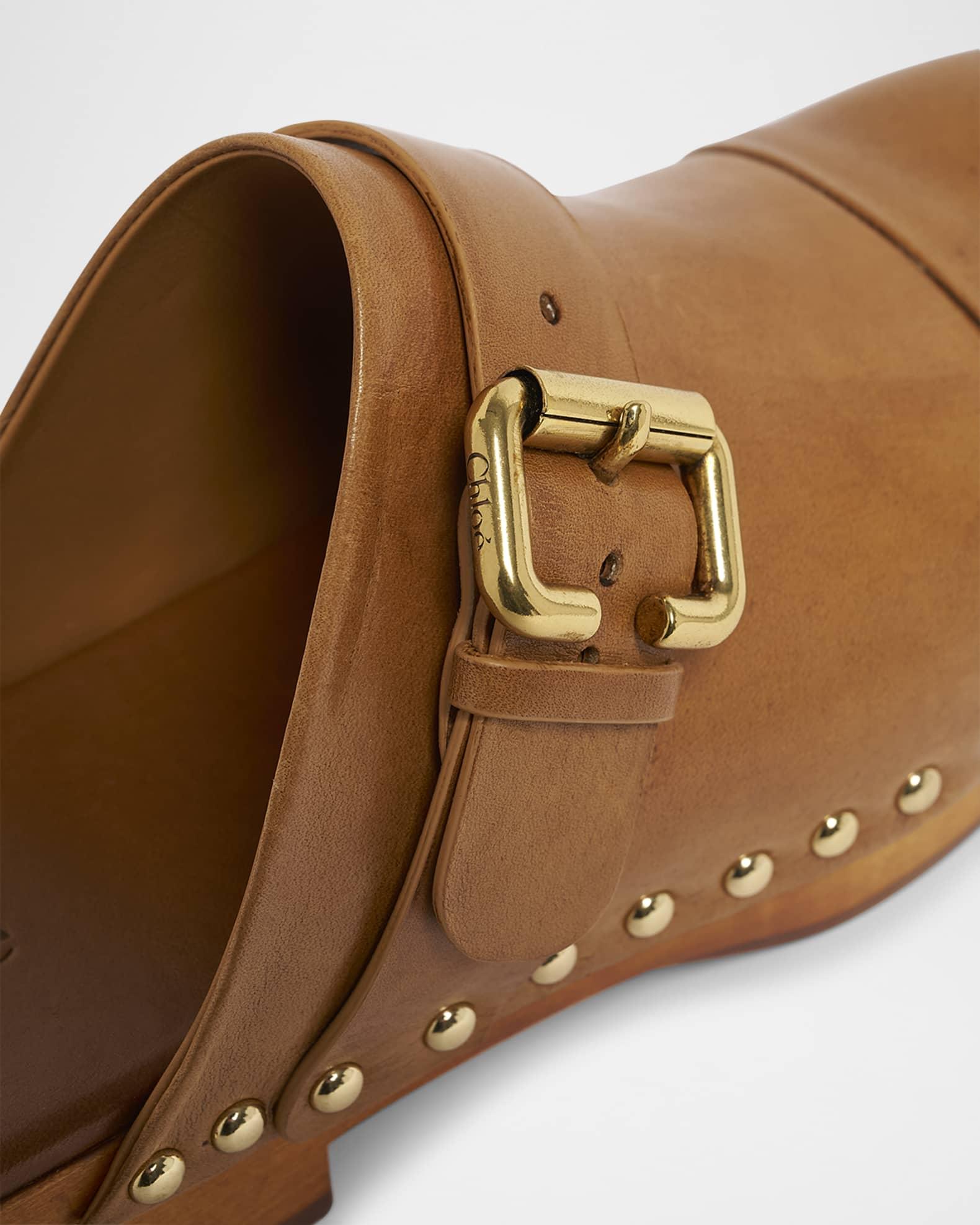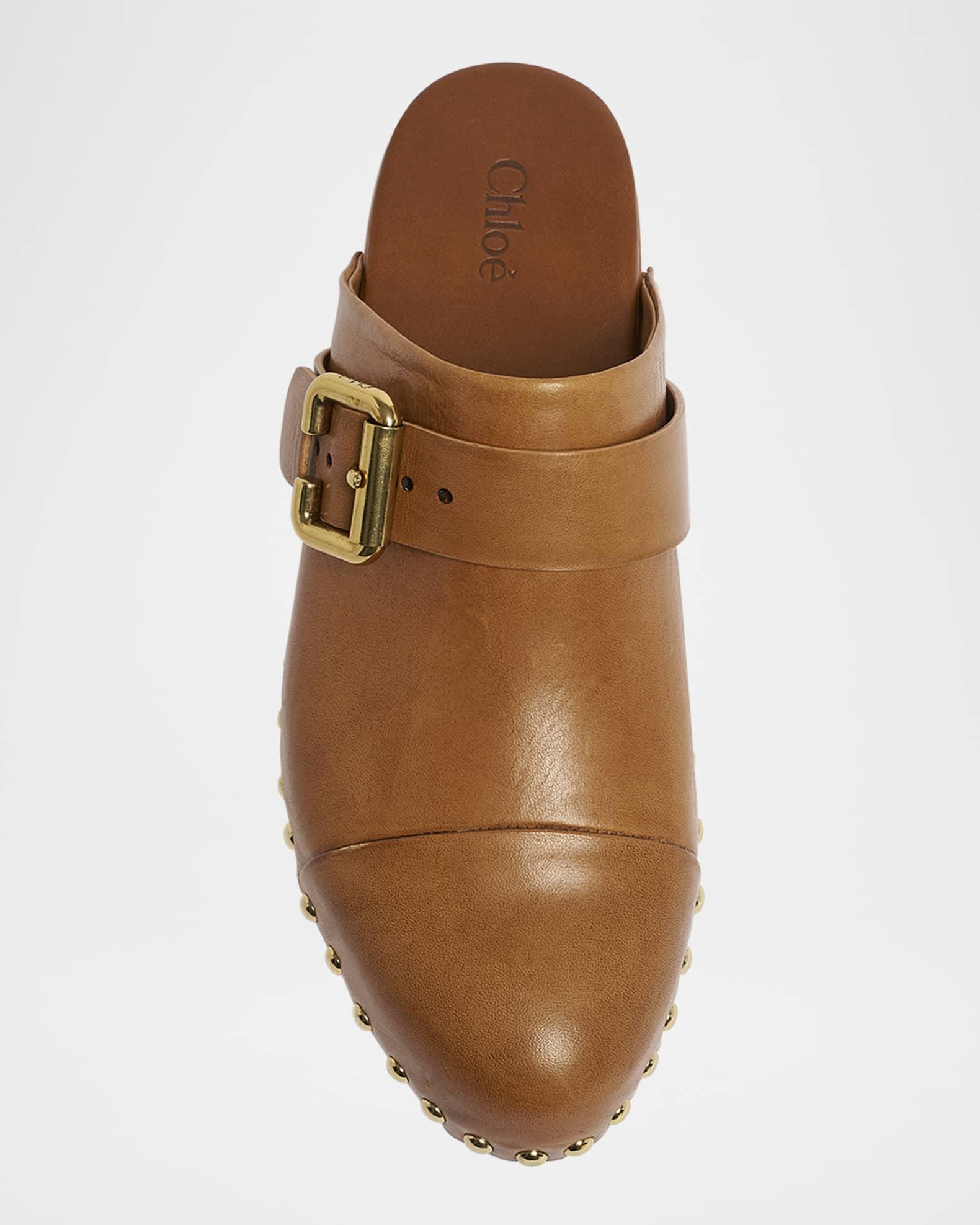 Chloe "Jeanette" calfskin leather clogs with signature C-buckle strap accent and goldtone studs 1.50 in / 40 mm wooden block heel Round cap toe Easy slide style Lightweight, sturdy TPU outsole Lining: Leather Professional cleaning recommended Made in Italy