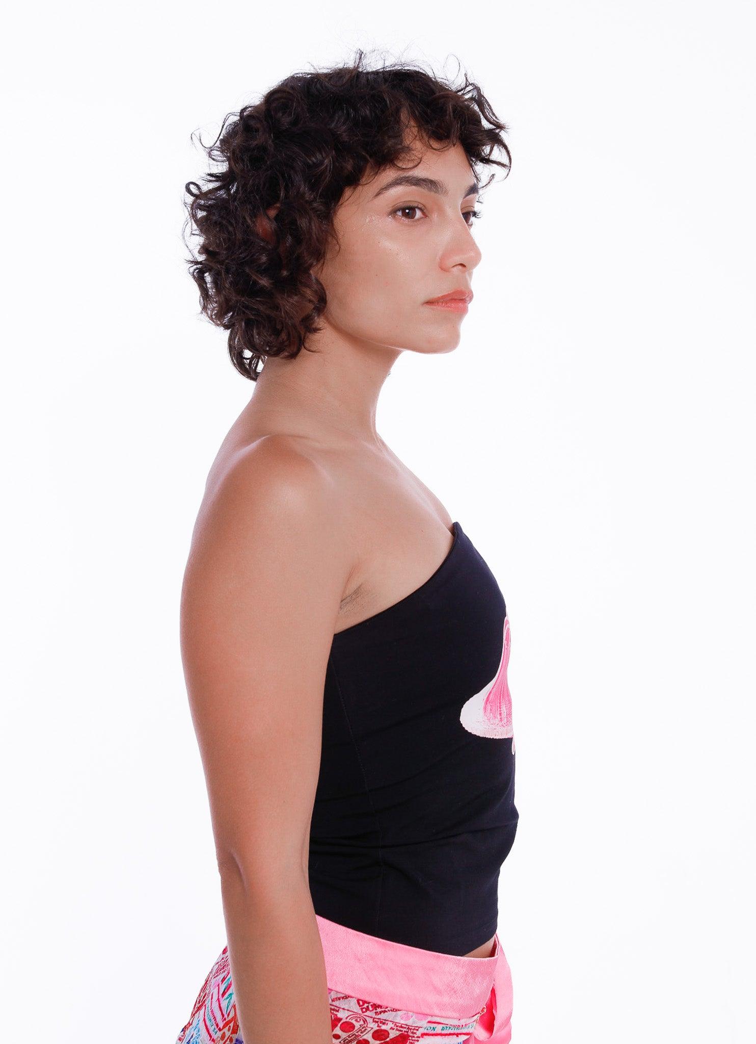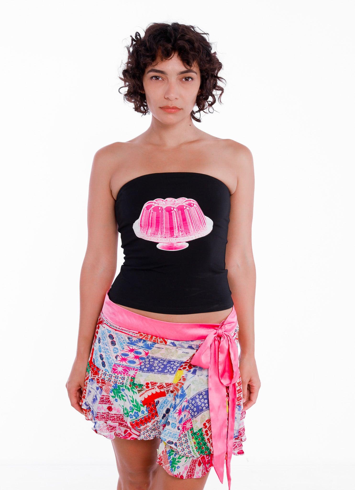 A sculptural silhouette with a glossy centerpiece. The Jelly Tube Top features a photoreal image of a vibrant pink molded dessert, placed front and center against a sleek black backdrop. The strapless cut follows a subtle sweetheart curve at the neckline, enhancing shape while maintaining a minimalist frame. Designed to hug close to the body, it’s a refined take on playful iconography—eye-catching without being overcomplicated.