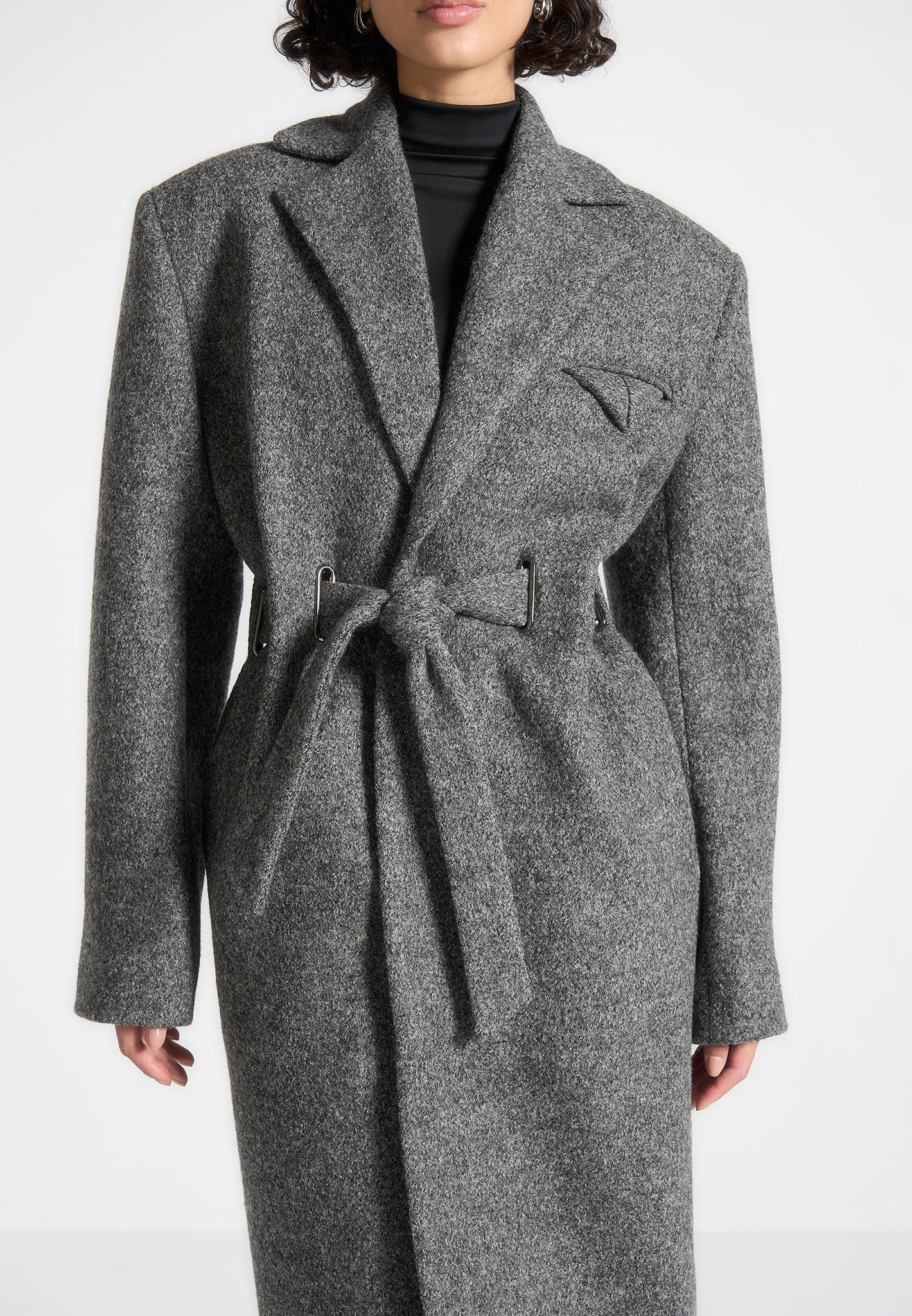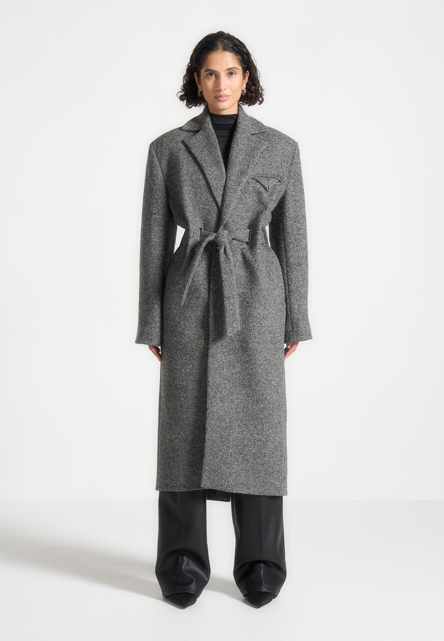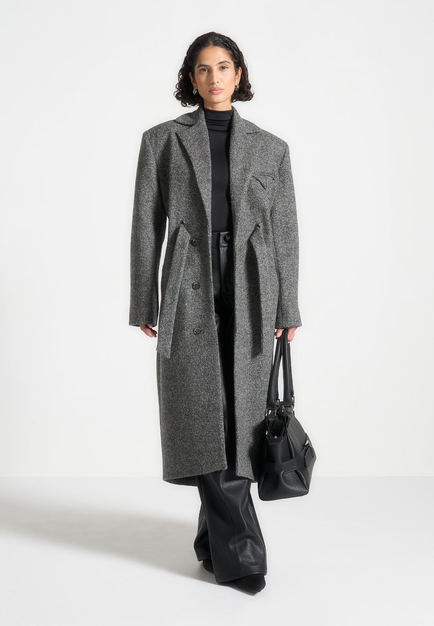 Crafted from soft wool, this longline coat combines warmth with refined structure. The elongated silhouette creates a sleek, streamlined profile, while the adjustable cinch waist belt allows for personalised definition. Finished with functional pockets, it balances timeless elegance with everyday practicality. Crafted from wool for a soft, premium finish Longline silhouette for a sleek, elongated look Adjustable cinch waist belt for personalised definition Functional pockets for everyday practicality Black Manière De Voir Eiffel plaque to centre back