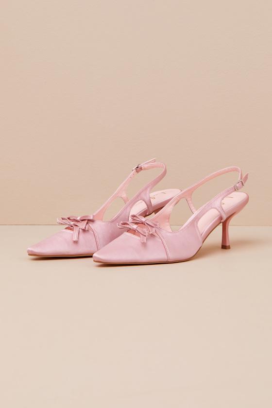 The Lulus Jeneva Blush Satin Pointed-Toe Slingback Pumps are the chicest plus ones you could bring along to any special event! Sleek woven satin shapes these elegant pumps that feature a pointed-toe upper adorned with dainty bow details and cutouts at the vamp. A slender, adjustable slingback strap secures with a shiny silver buckle, all atop a stiletto-style heel.