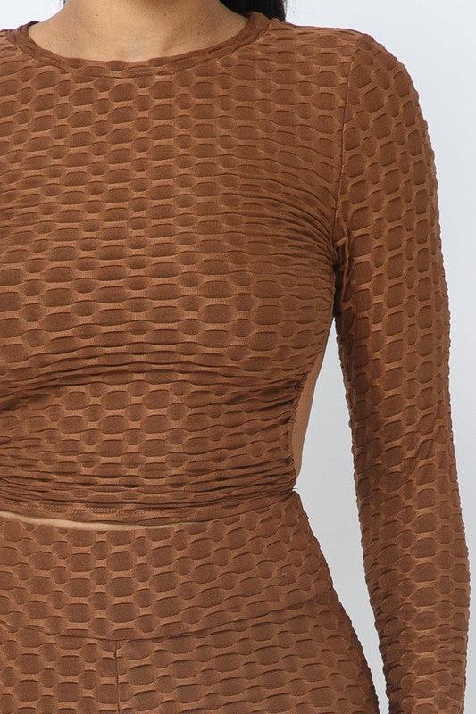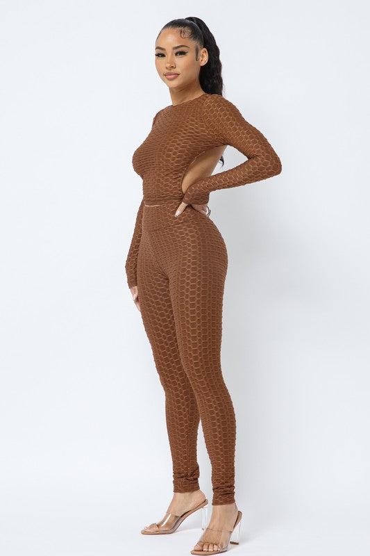 A trendy two-piece long sleeve top and legging set for women in brown. Designed with lightweight fabric for the perfect going-out set. Rounded neckline Cut-out back design Long sleeves High-waisted Form-fitting silhouette Ribbed knit fabric *NOTE: unbranded items are sold as-is without any Rockstar Original labels.