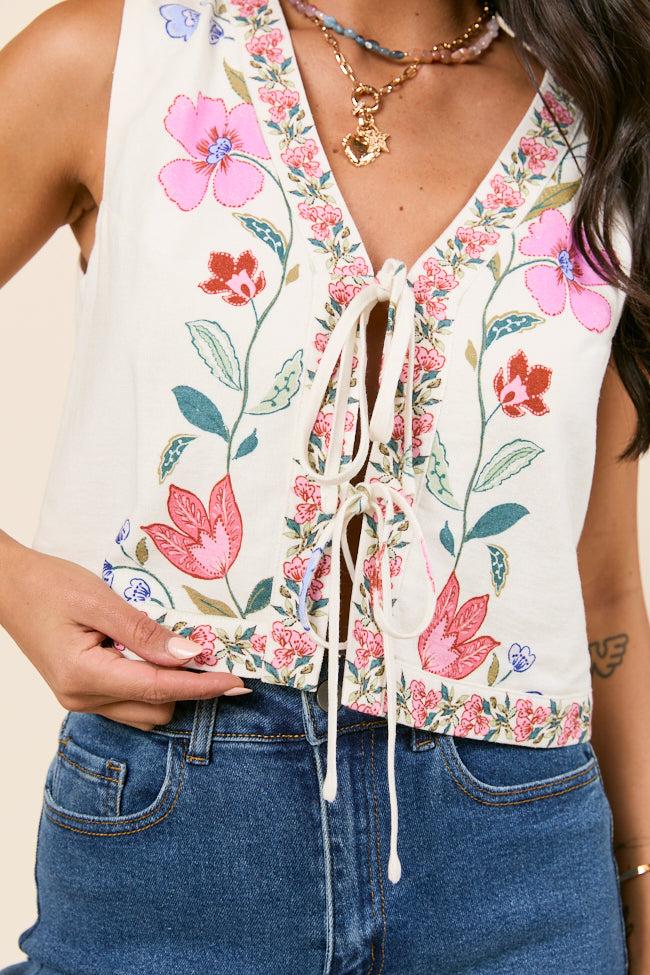 Details Floral Tie Vest Fabric has no stretch Sleeveless, functional tie front closure , all over border print Lined Size small from shoulder to hem: 16" Material and Care 85% rayon 15% linen lining: 100% rayon Hand wash cold, line dry Patterns may vary Materials may have natural variations Colors may vary from different viewing devices.