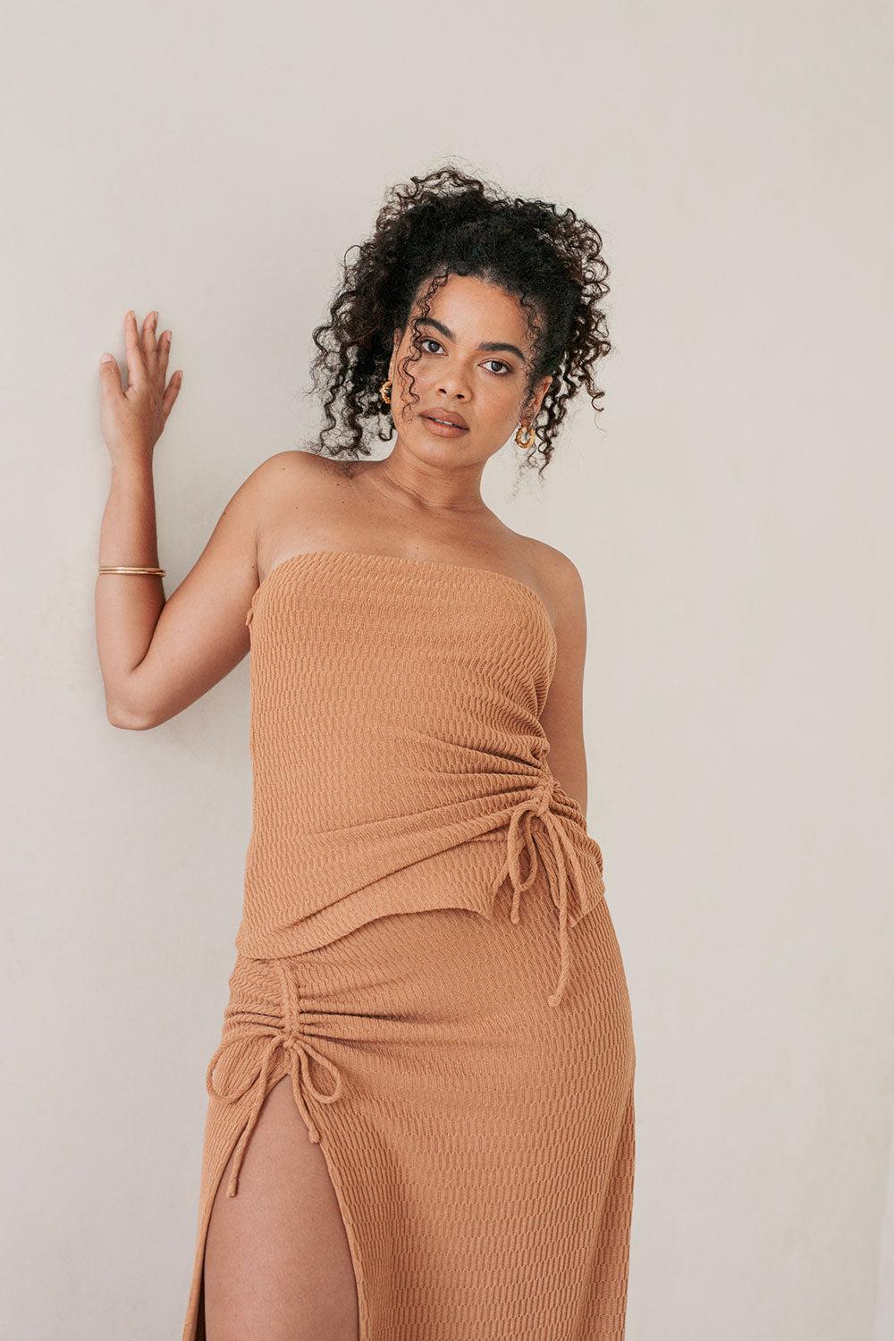 The simple and flattering Jenna Top is made from a textured woven fabric in a tan hue. It features a strapless neckline, longline hem and adjustable draw detail at side. Get the set and pair with the Jenna Skirt and style with heels! Designed exclusively by Sabo.