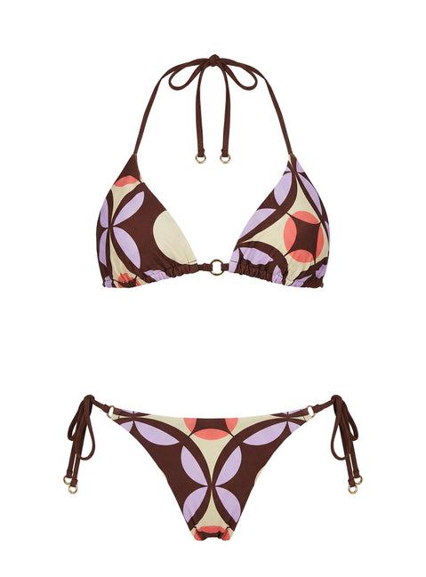 Geo print detail, cheeky bottoms, hoop ring detail, branded gold-hardware at back