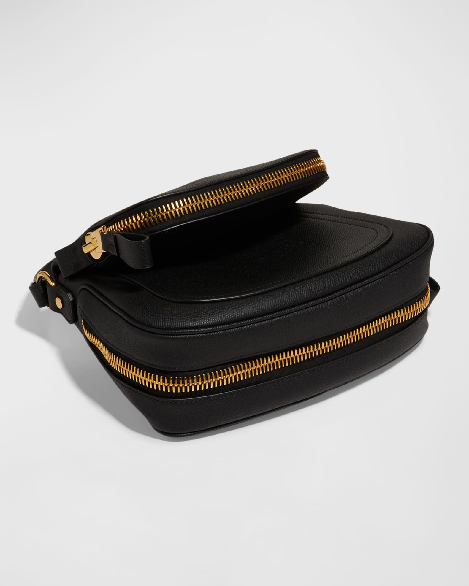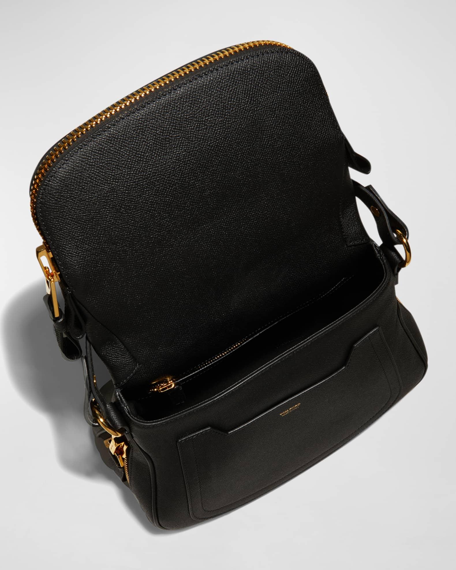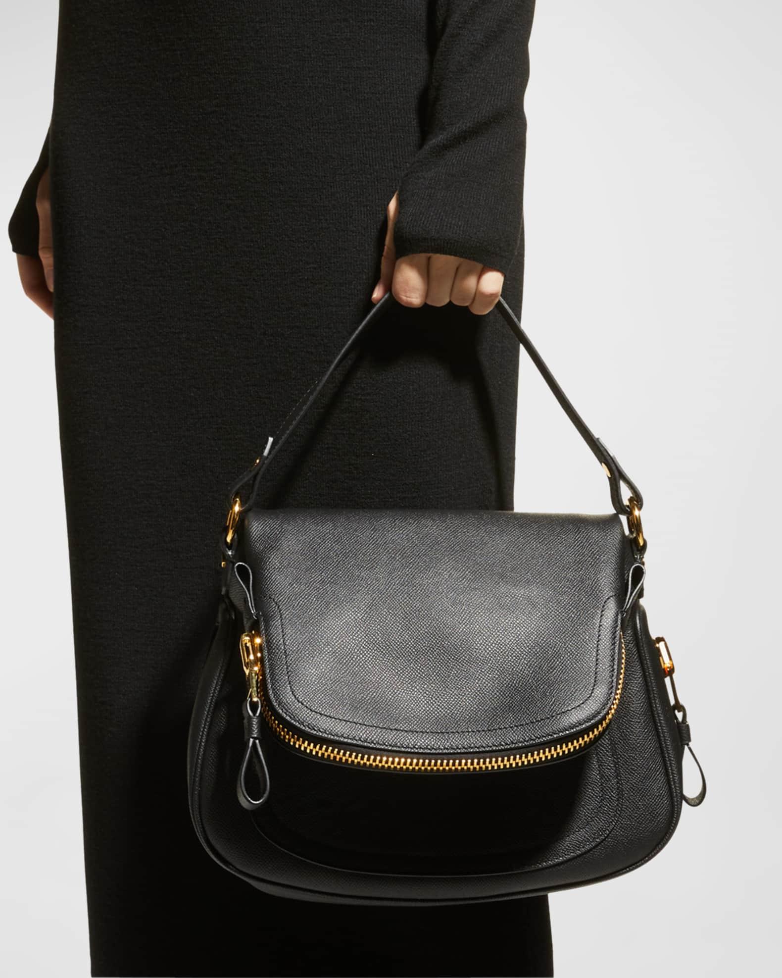 TOM FORD grained calf leather shoulder bag. Flat top handle, 6.7" drop. Removable shoulder strap, 41.7"L. Zip-around fold-over flap. Slip pocket under flap. Expandable zip-around sides. Interior, cotton lining; one zip pocket. 9.5"H x 12.6"W x 6"D. "Jennifer" is made in Italy.