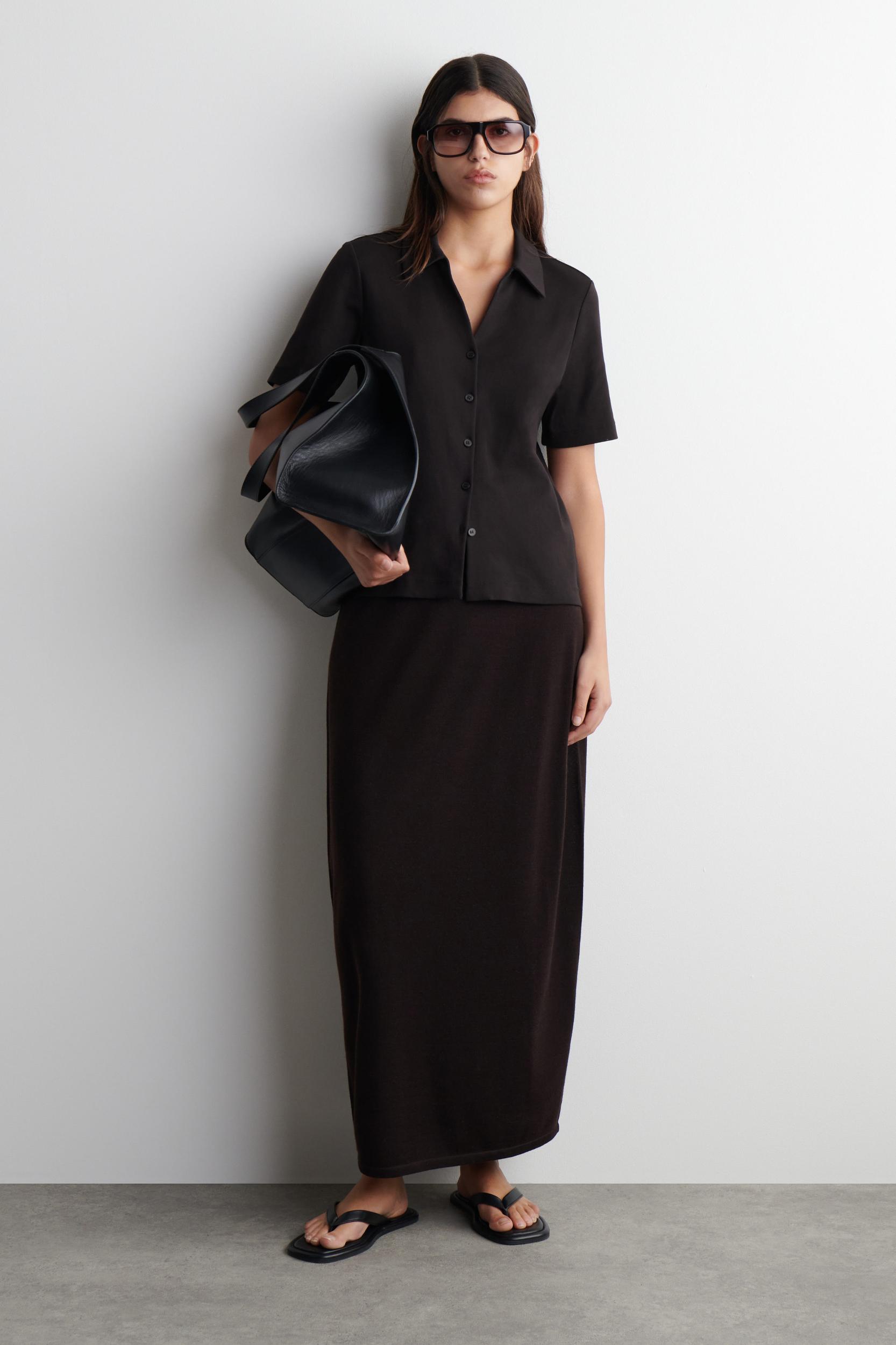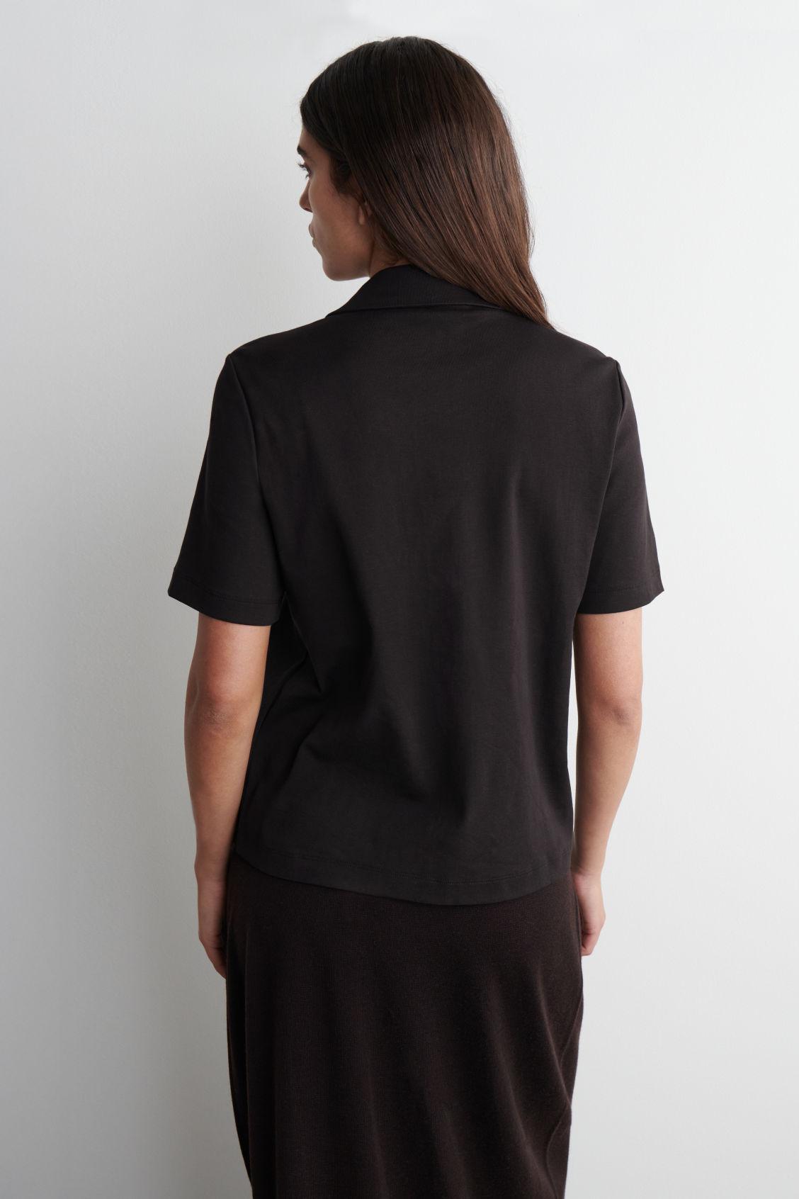 Refined silhouettes are a pillar of the COS womenswear collection. Inspired by resortwear, this modern shirt is crafted from luxuriously soft cotton-jersey and cut in a form-fitting shape with a pointed collar and deep neckline. The rich espresso hue lends it to easy styling. Slim fitButton closure Shell: 100% Cotton. Excluding trims / Machine wash Back length of size S is 60cm / Model wears a size S