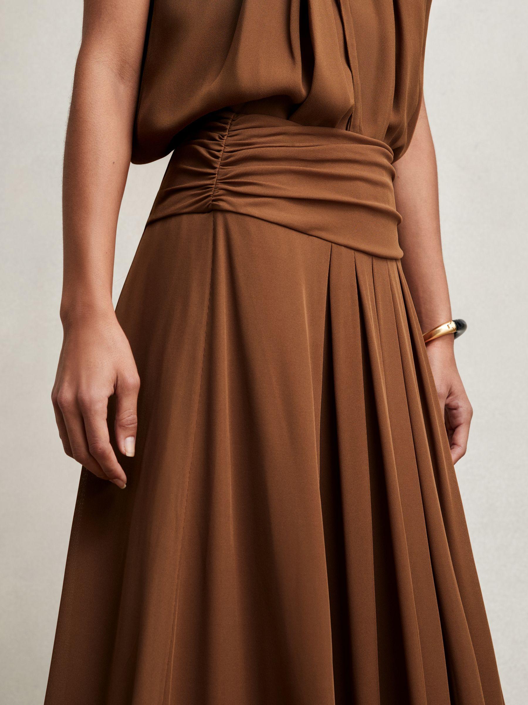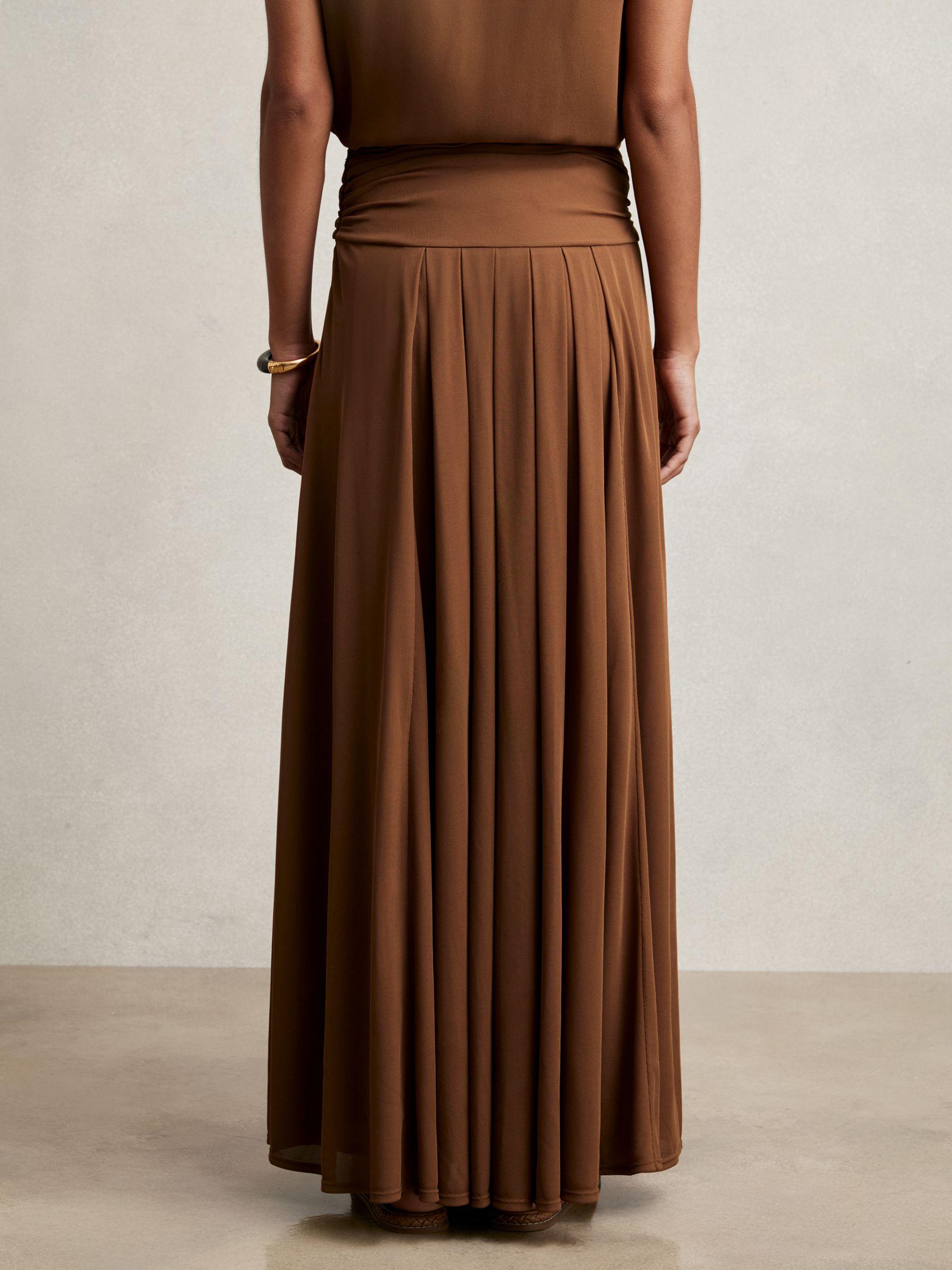 Layers of semi-sheer jersey fall through a ruched waistband and soft pleats, giving the Saffron maxi skirt a romantic, fluid drape. A concealed zip secures at the side. Semi-sheer jersey fabric Ruched waistband Pleating Concealed side zip The model is wearing a size 8 Measurements of model: 5ft9 / 175cm