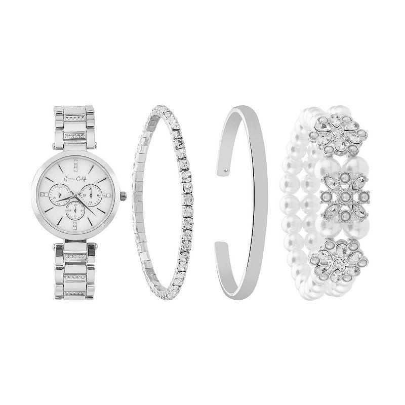 Jessica Carlyle Silver-Tone Watch & Bracelet Set with Crystal Accents & Simulated Pearl Details, Womens