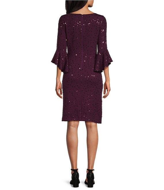 Jessica Howard Boat Neck 3/4 Bell Sleeve Pleated Waist Sequin Sheath Dress