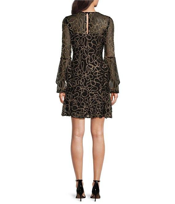 Jessica Howard Embellished Mesh Round Neck 3/4 Bell Sleeve Flounce Hem Dress