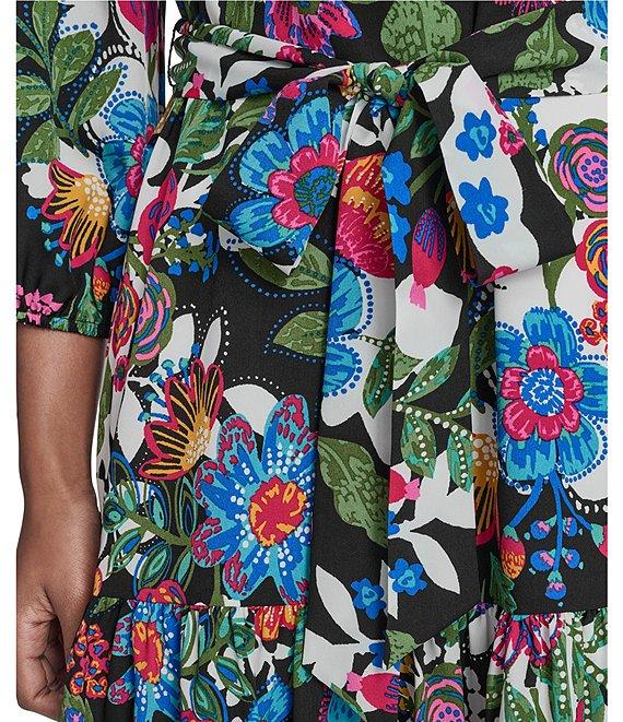 From Jessica Howard, this dress features: CDC fabrication V-neckline 3/4 balloon sleeves Floral print Fit and flare silhouette Tie-sash at waist Lined Center back zipper closure Approx. 37" in length Polyester Machine wash/line dry Imported.