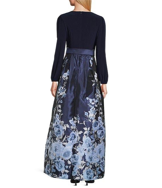 Jessica Howard Floral Print Knit Jersey Surplice Neck Long Sleeve Jacquard Belted Ball Gown