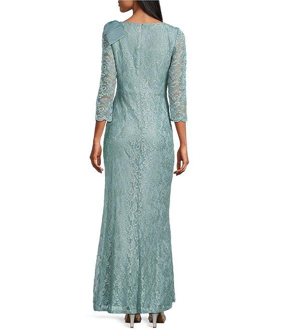 Jessica Howard Lace 3/4 Sleeve Asymmetrical Neck Bow Shoulder Side Tuck Gown