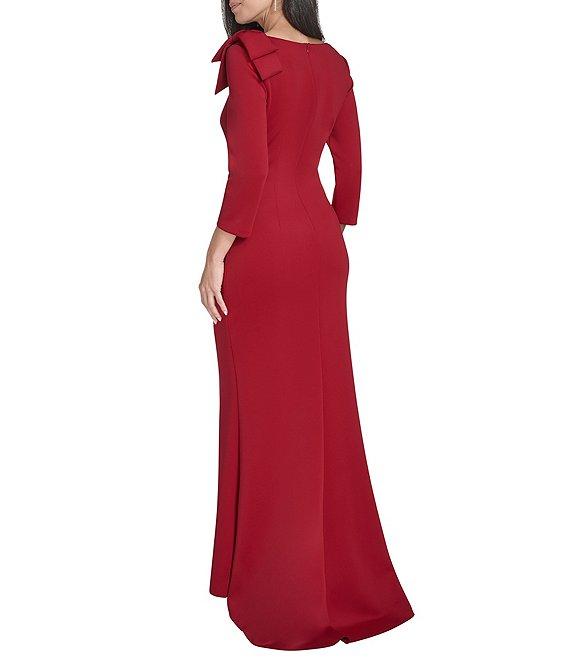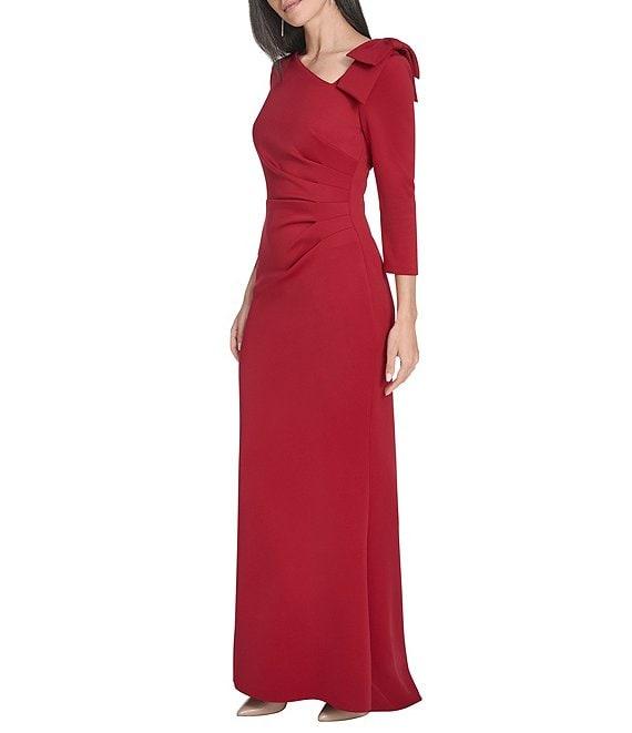 From Jessica Howard Petite, this dress features: Scuba knit fabrication Asymmetrical neckline 3/4 sleeves Side tuck detail Bow at shoulder Partially lined Center back zipper closure Approx. 58" in length from high point shoulder Polyester/spandex Hand wash/dry flat Imported.