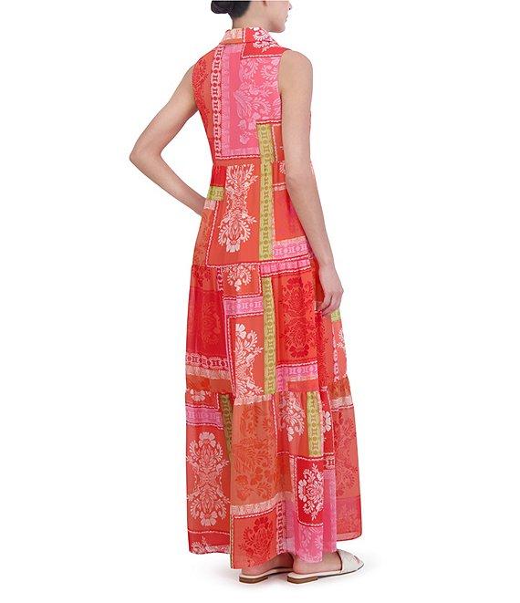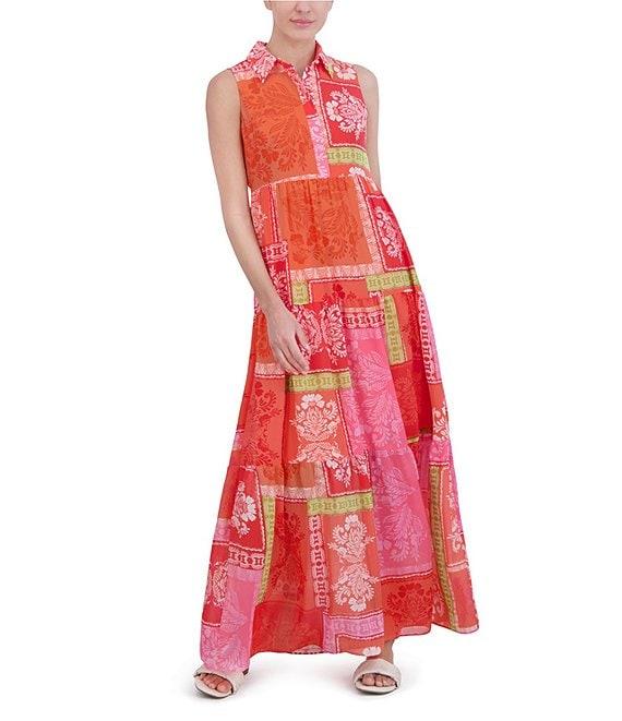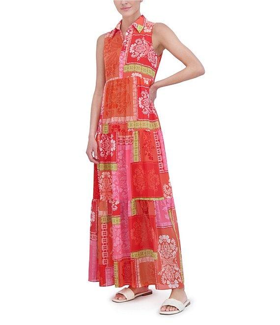 Jessica Howard Petite Size Sleeveless Collared Neck Patchwork Print Maxi Dress