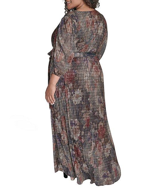 From Jessica Howard Plus, this dress features: Metallic knit fabrication V-neckline Long sleeves Sash belt around waist Side tucks Lined Center back zipper Approx. 61" in length from high point shoulder Polyester/metallic Hand wash cold/lay flat to dry Imported.