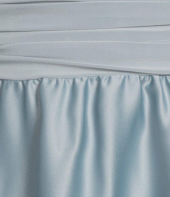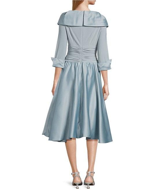 From Jessica Howard, this dress features: Knit jersey and satin fabrication V-neckline Portrait collar Ruched waist 3/4 sleeves Rhinestone button cuff Lined Center back zipper closure Approx. 46" in length Polyester/spandex Dry clean Imported.