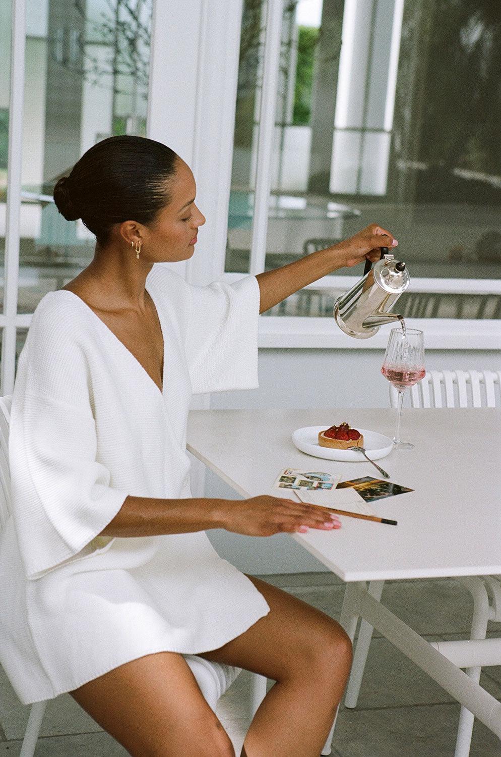 *BACK IN STOCK* The perfect easy-to-wear trans seasonal piece, the Jessie Wrap Dress is made from a white knit fabric in off white. It is a super relaxed style featuring drop shoulders, short sleeves, cross-over V neckline with button at side, asymmetric hem and ribbed trims. Designed exclusively by Sabo.