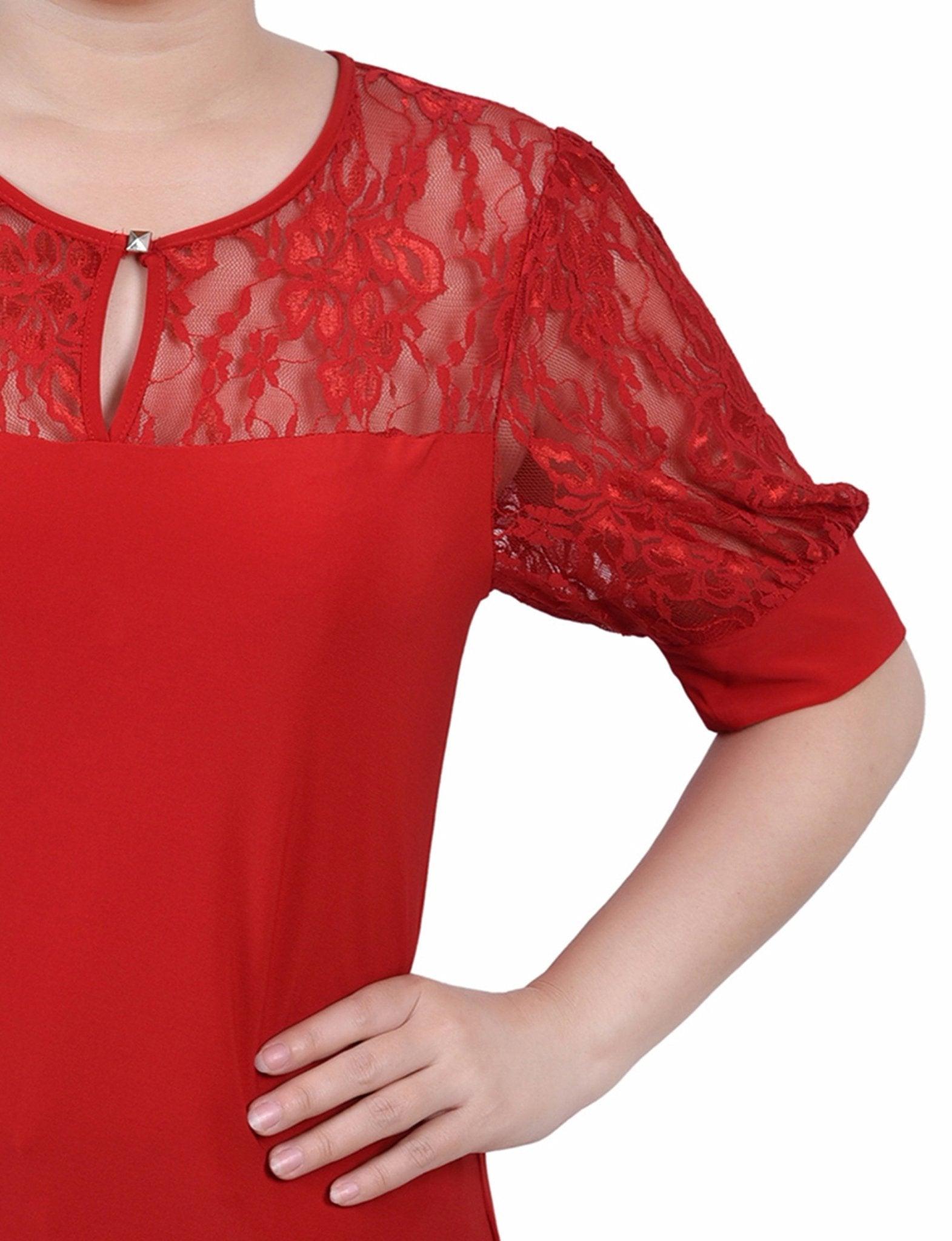 Jester Red Short Puff Sleeve Top With Lace Sleeves And Yoke - Petite