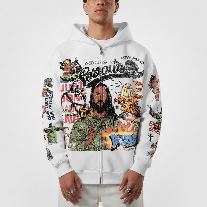Shop Jesus Print Graphic Zip Up Hoodie at Sopula Clothing. SPU: CP-164033-QX Fabric Name: Fleece-lined Pattern: Jesus Multi-Element Print Process: Zipper Style: Vintage Length: Regular Collar: Hoodie Collar Popular Elements: Pocket, Jesus Sleeve Type: Drop Shoulder Sleeve Occasion: Daily, Street Theme: Fall, Winter