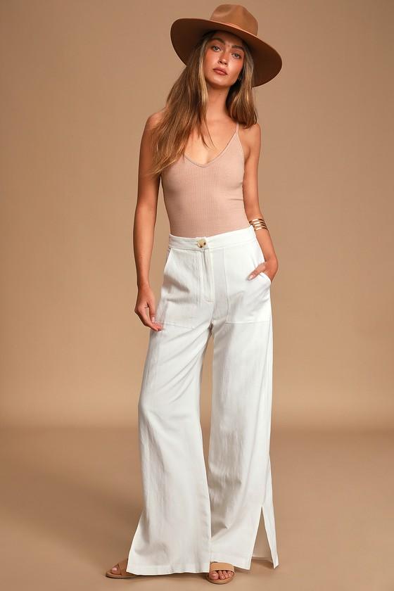 Whether you're jet setting to an exotic locale or cruising the local spots, the Lulus Jet Stream White High-Waisted Wide-Leg Pants will keep you chic! Lightweight linen-blend woven fabric creates these breezy pants and their high-waisted fit, front pork chop pockets, and wide pant legs with slit hems. Tortoise top button and hidden zip fly.