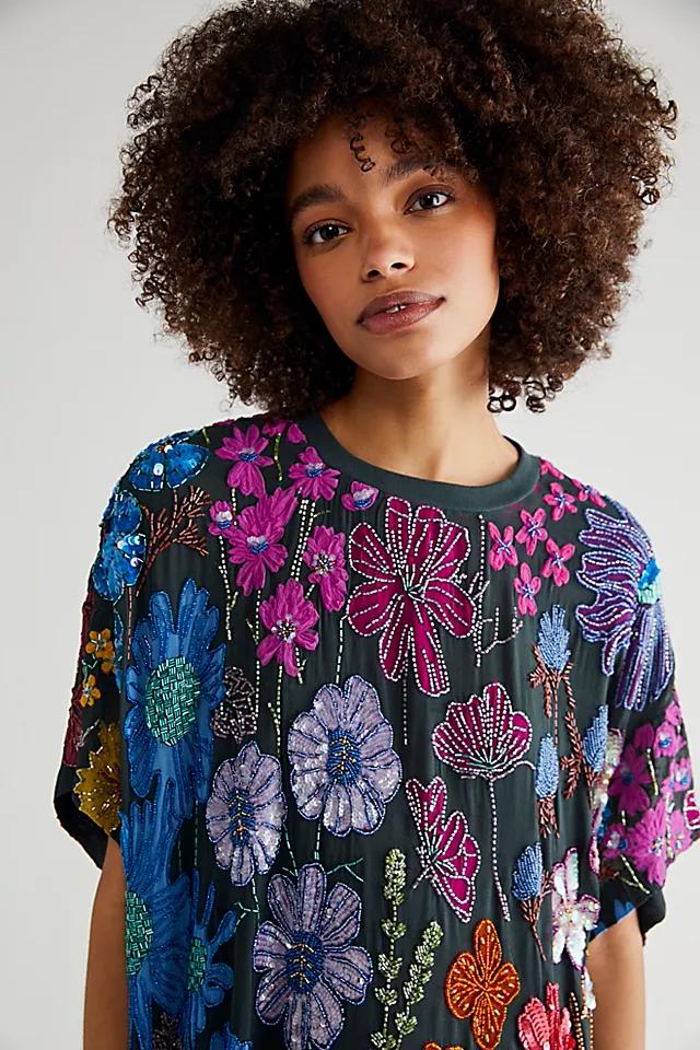Forever essential and just as versatile, this retro-inspired mini dress is featured in a timeless, t-shirt silhouette with beaded floral detailing throughout for added dimension.