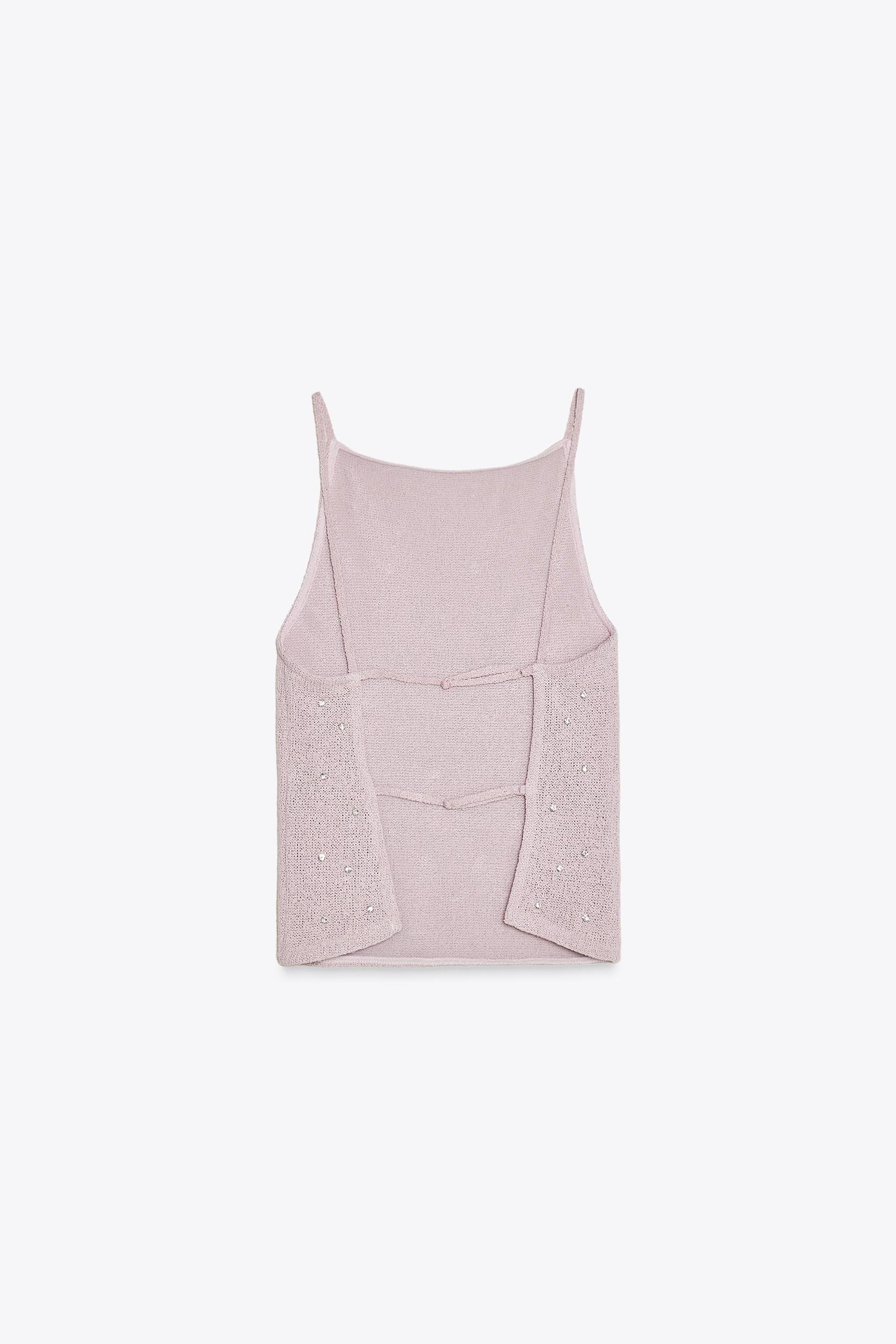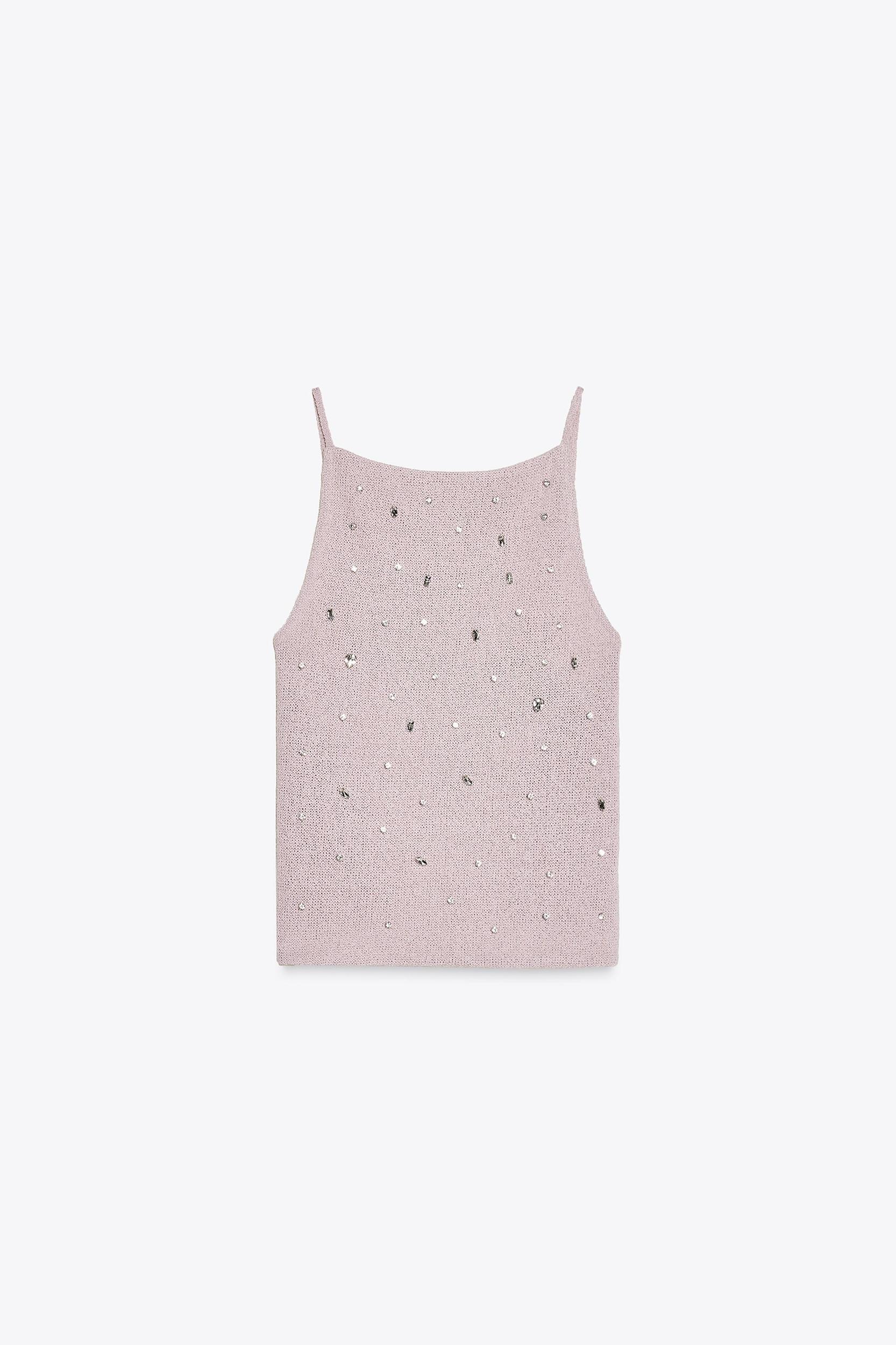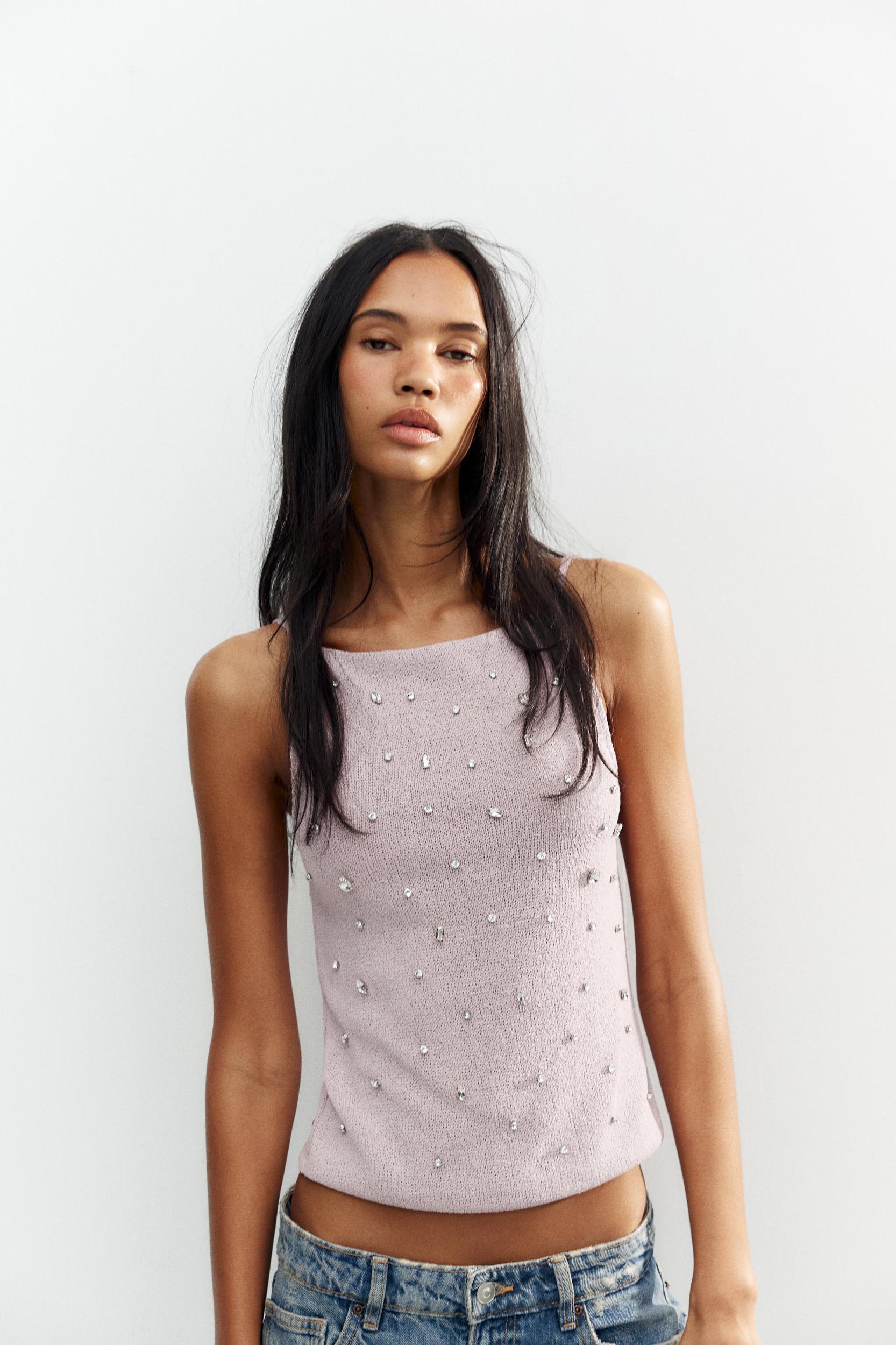 Top made of textured fabric with a straight neckline and spaghetti straps. Open back with adjustable straps. Jewel appliqué detail.