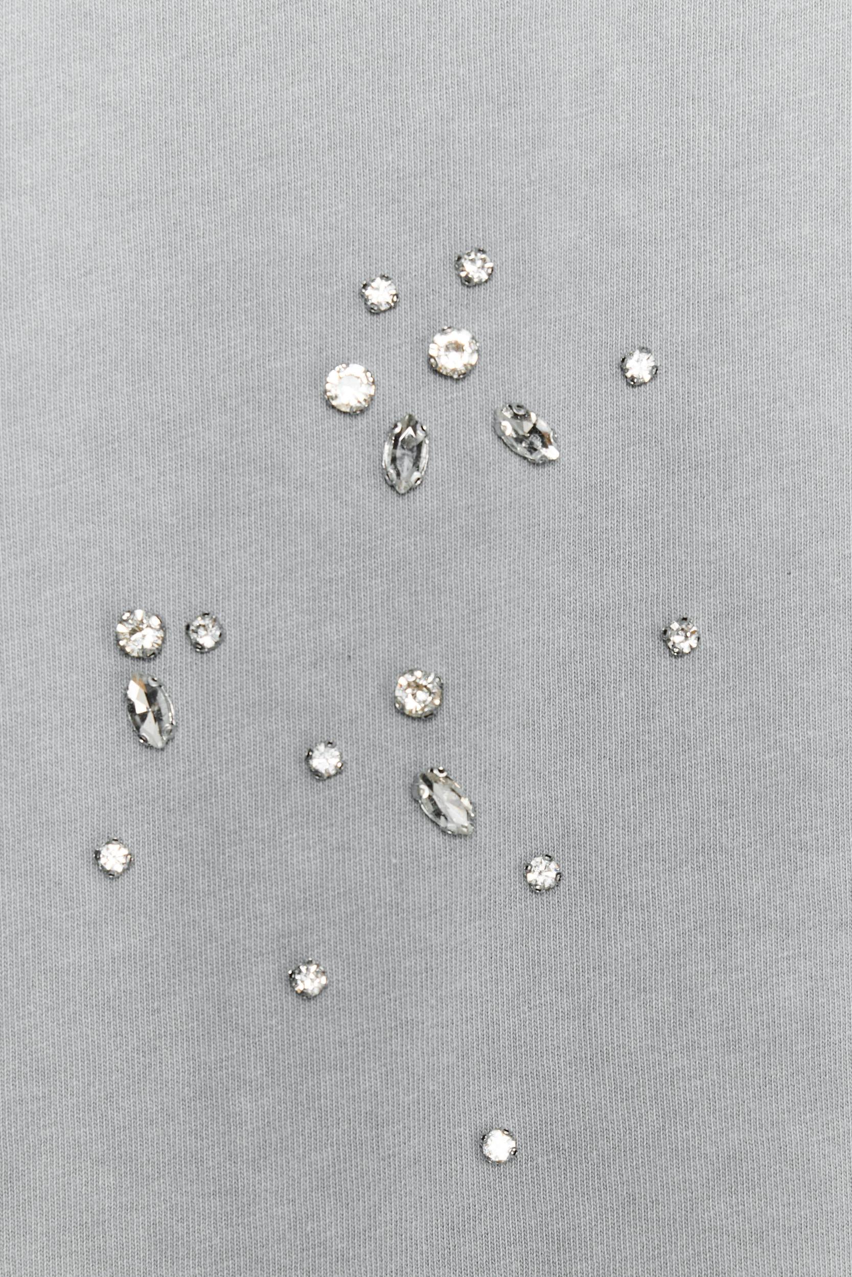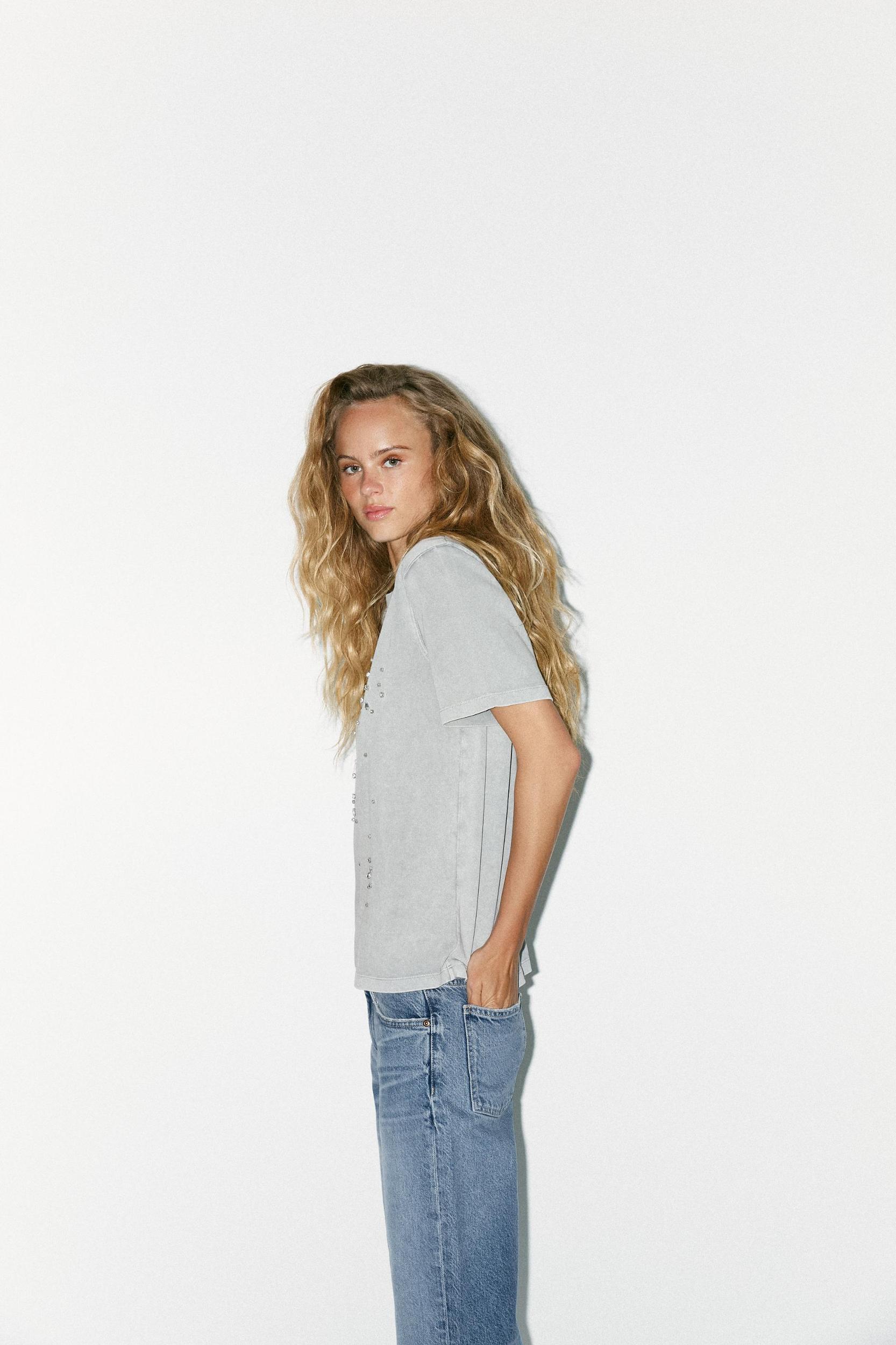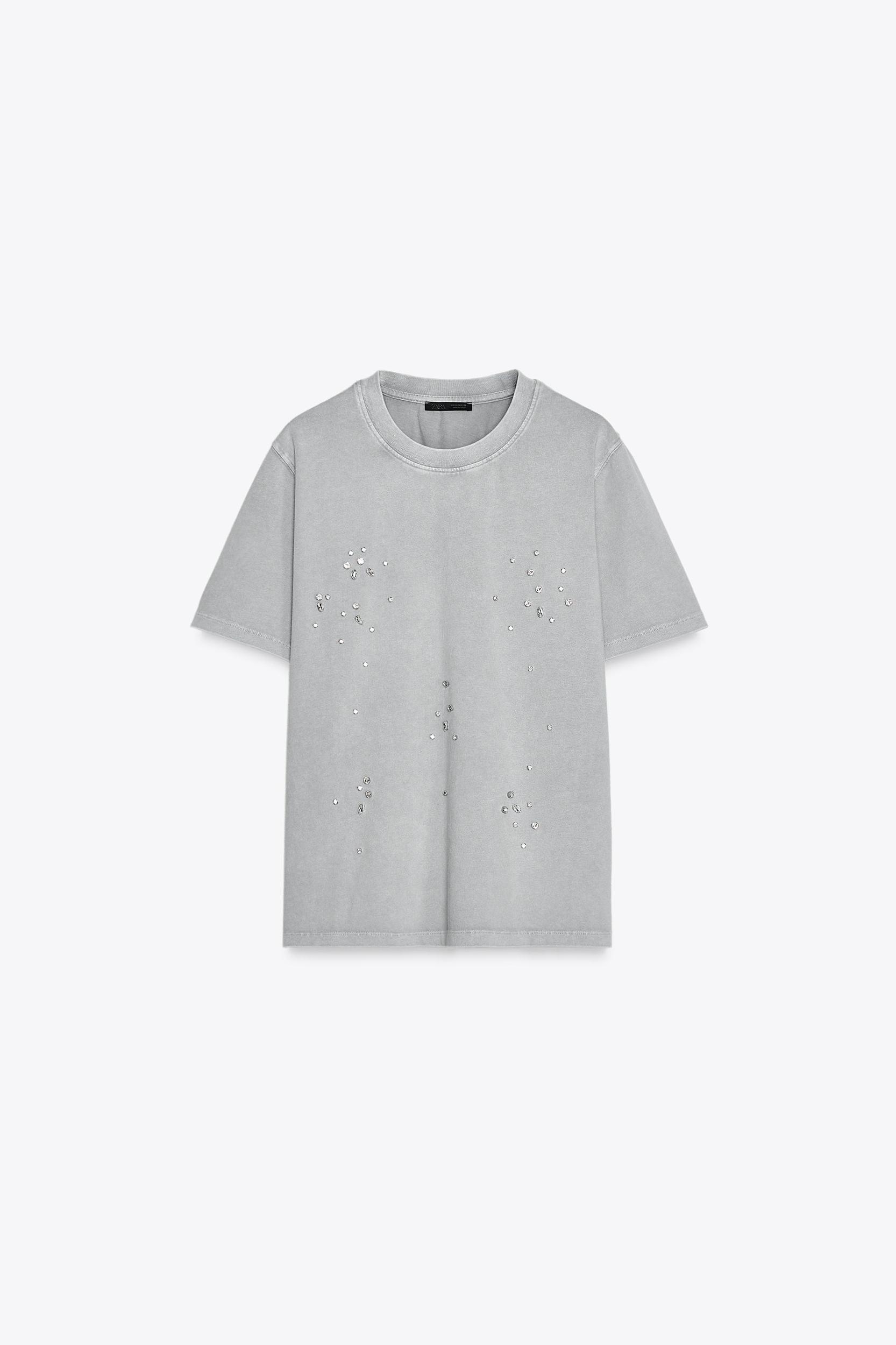T-shirt made of 100% washed cotton yarn. Round neck and short sleeves. Jewel appliqué detail.