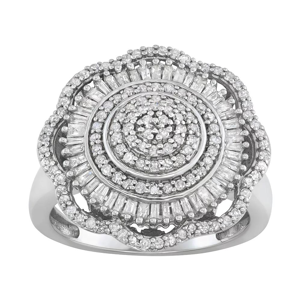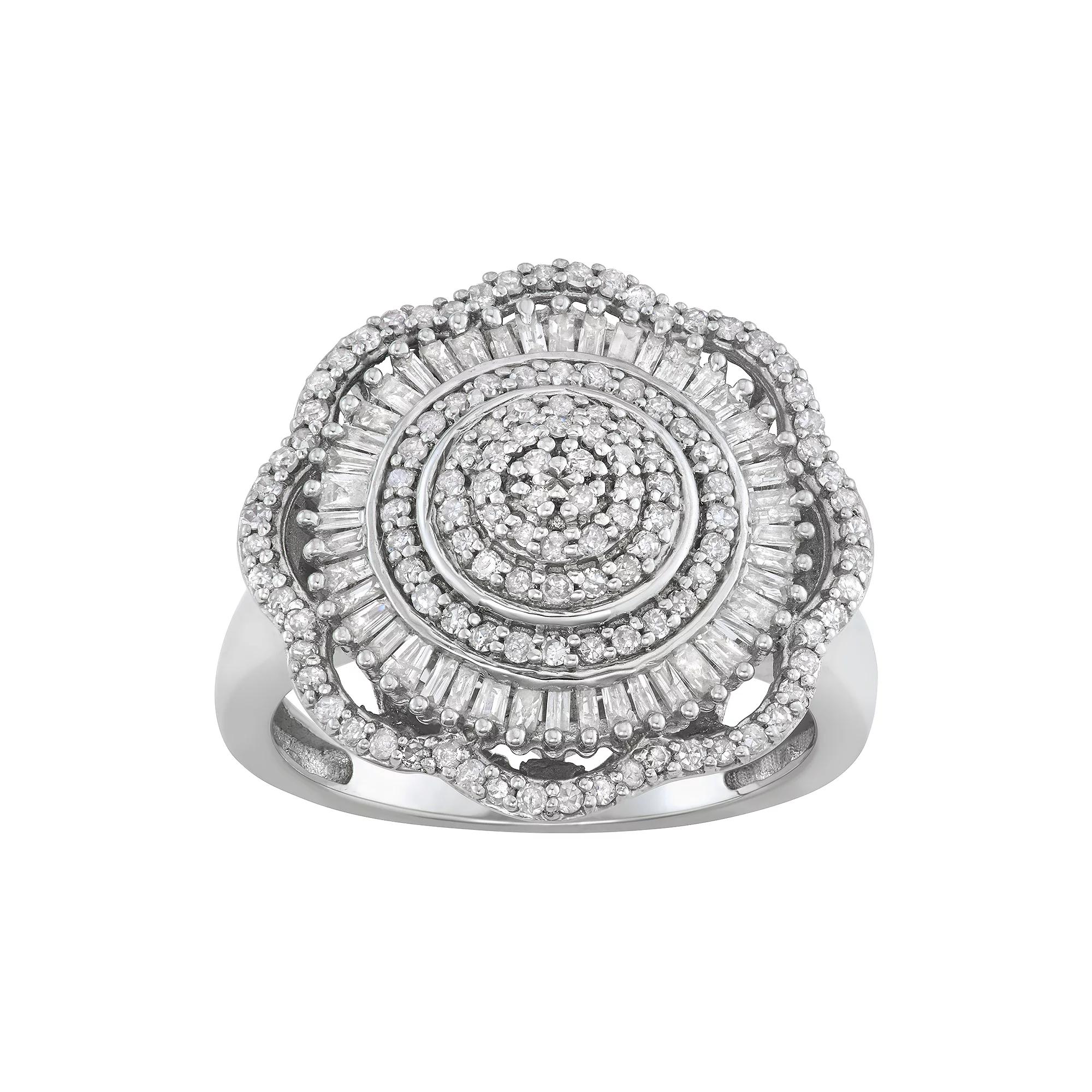 An intricate, layered diamond design gives this sterling silver ring a lovely, unique look. An intricate, layered diamond design gives this sterling silver ring a lovely, unique look. Ring width: 0.74 mm Base material: sterling silver Plating: sterling silver Finish: polishedSTONE DETAILS Setting: prong Total weight: 1 ct. Color grade: H-I Clarity: I2-I3 Gemstones may have been treated to enhance their appearance. Special care may be required. Please visit our Gemstone Treatment & Special Care Guide for more information. Size: 6. Color: White. Gender: female. Age Group: adult.